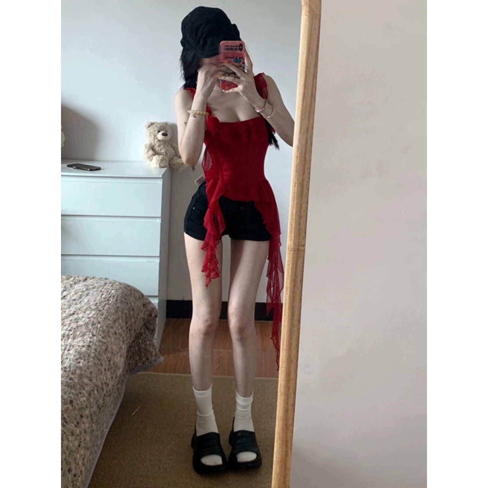 泰国辣妹立体玫瑰吊带背心女夏季小众设计不规则飘带网纱无袖上衣