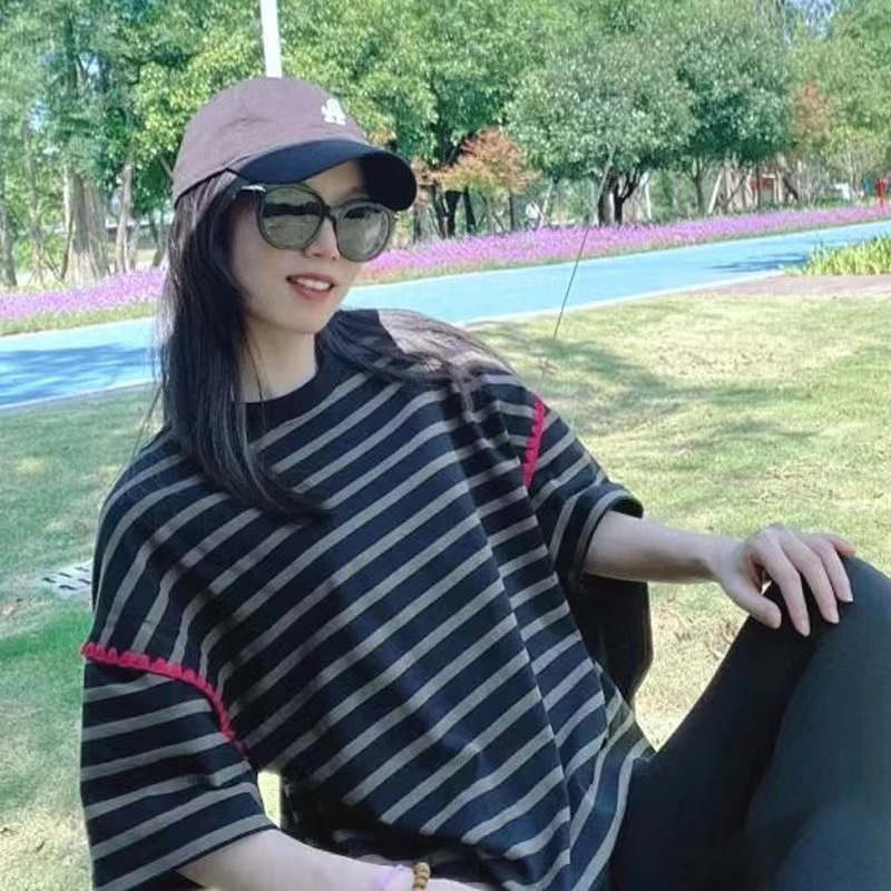 韩系夏新款潮牌款条纹彩色毛线刺绣短袖条纹t恤慵懒舒适男女同款
