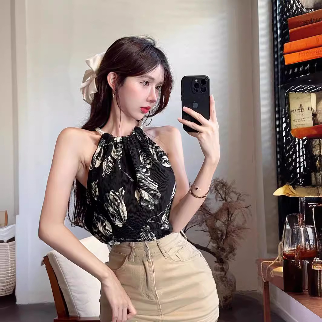 珠链挂脖款无袖吊带背心女夏季新款褶皱宽松花朵套头显瘦上衣女装