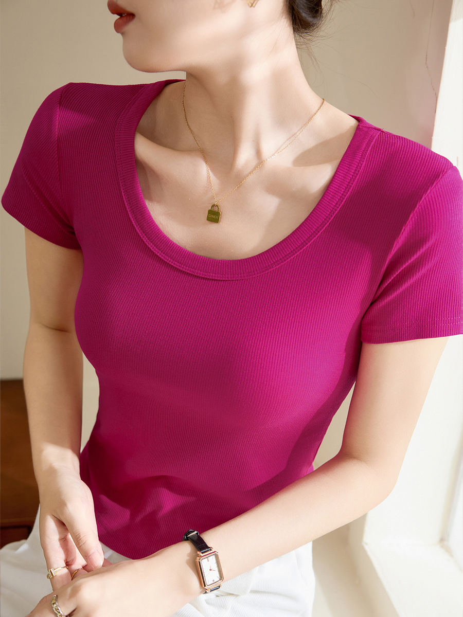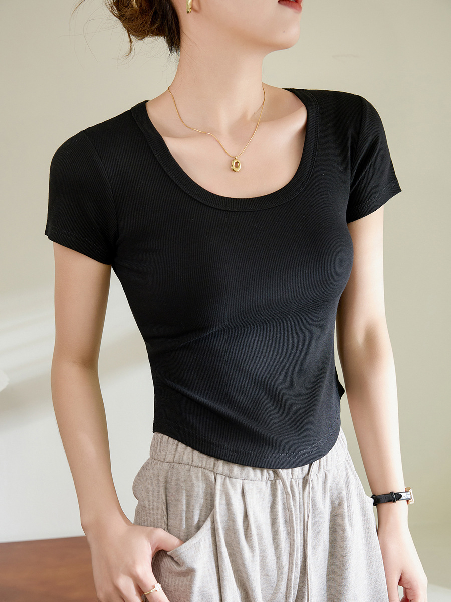 【用好料】弧形T恤女短袖夏季新款高弹螺纹棉短款圆领打底衫