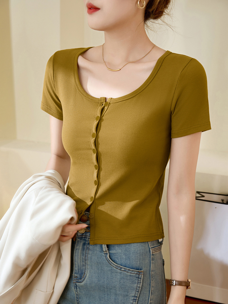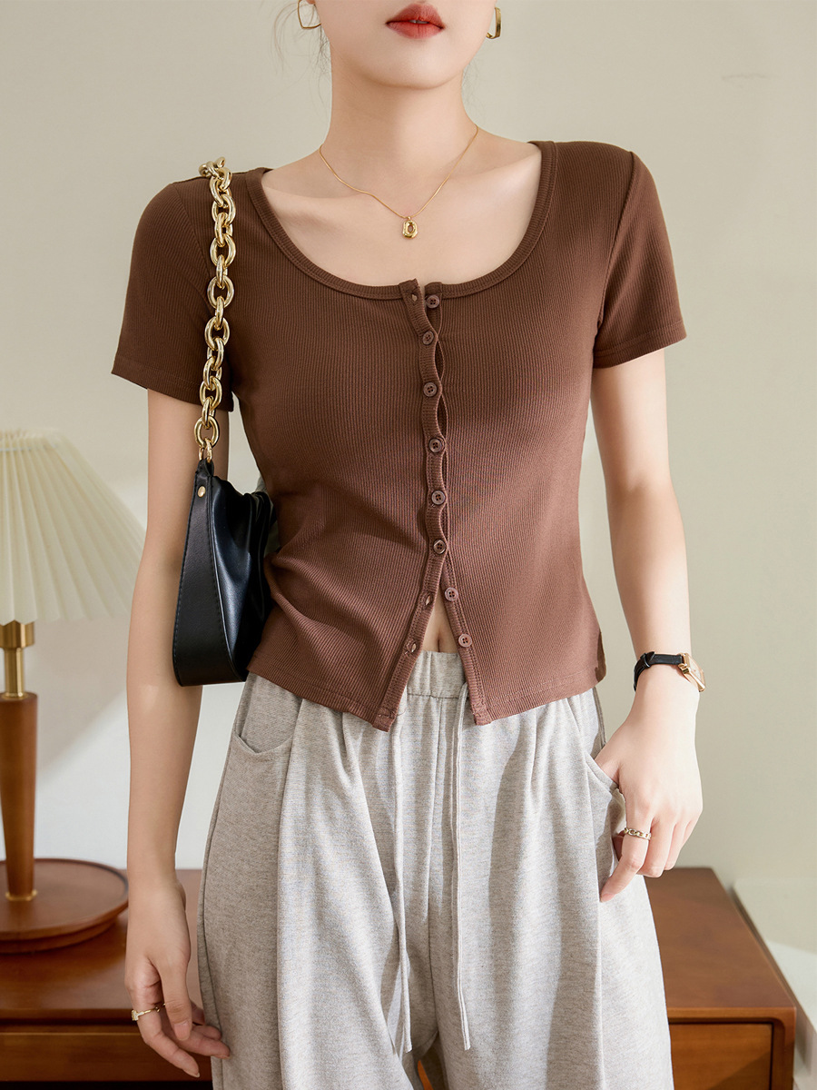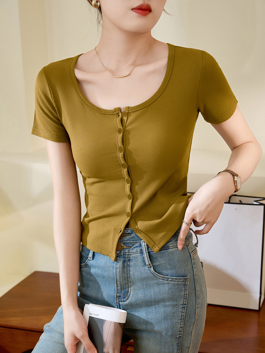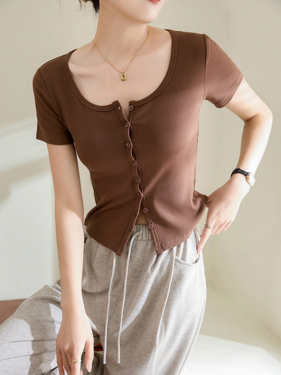【质做高品】单排纽扣T恤女短袖夏季新款螺纹棉高腰短款上衣