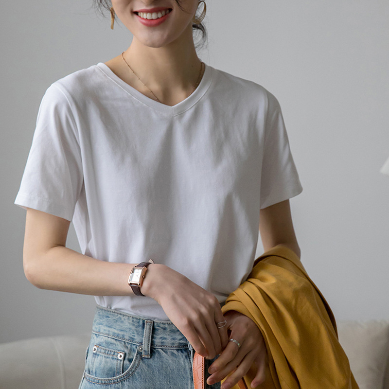 230g精细纯棉V领短袖t恤女宽松百搭显瘦韩版夏新款打底衫上衣