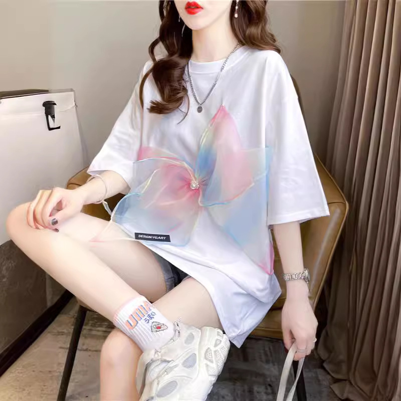 欧货T恤女短袖2025年新款夏装学生宽松大码中长款蝴蝶结上衣服潮