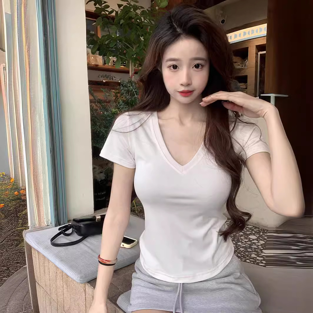 纯欲辣妹短袖T恤女夏季新款法式正肩短款打底修身锁骨简约上衣ins