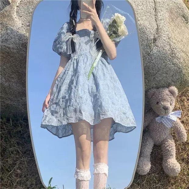 初恋白月光连衣裙夏新款仙女裙方领提花蓬蓬裙小个子连衣裙女