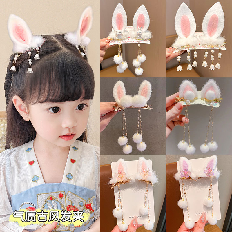儿童古风发夹粉色毛球流苏发卡可爱兔耳朵头饰女宝宝2025冬季发饰