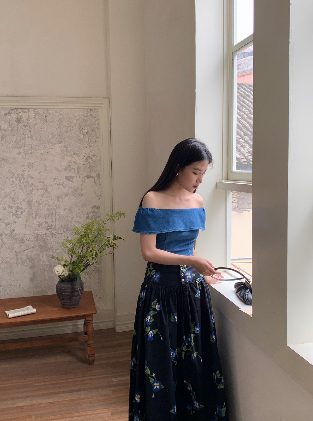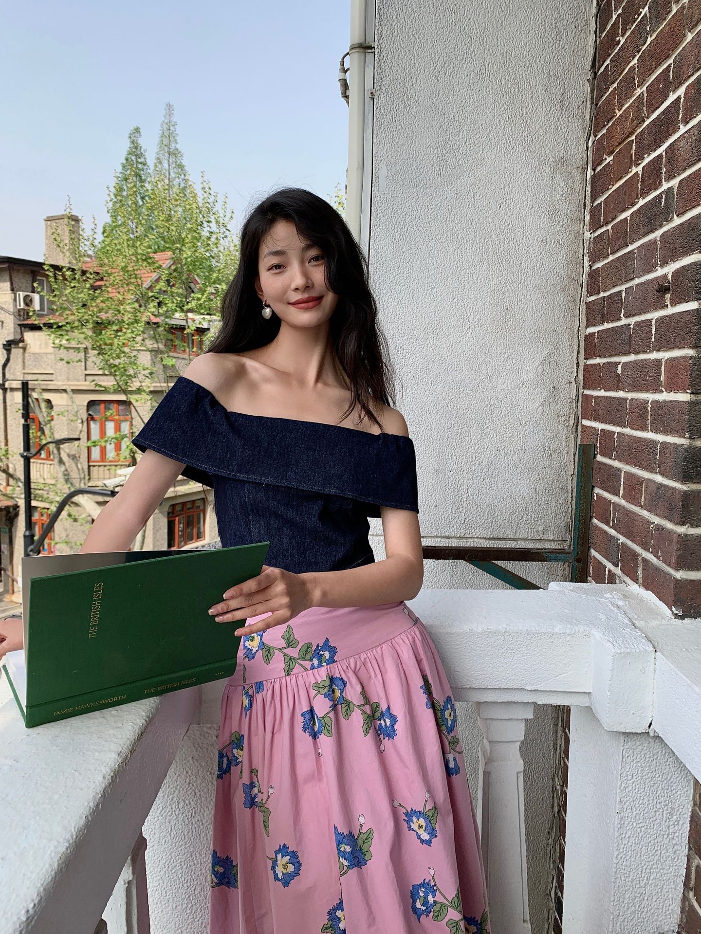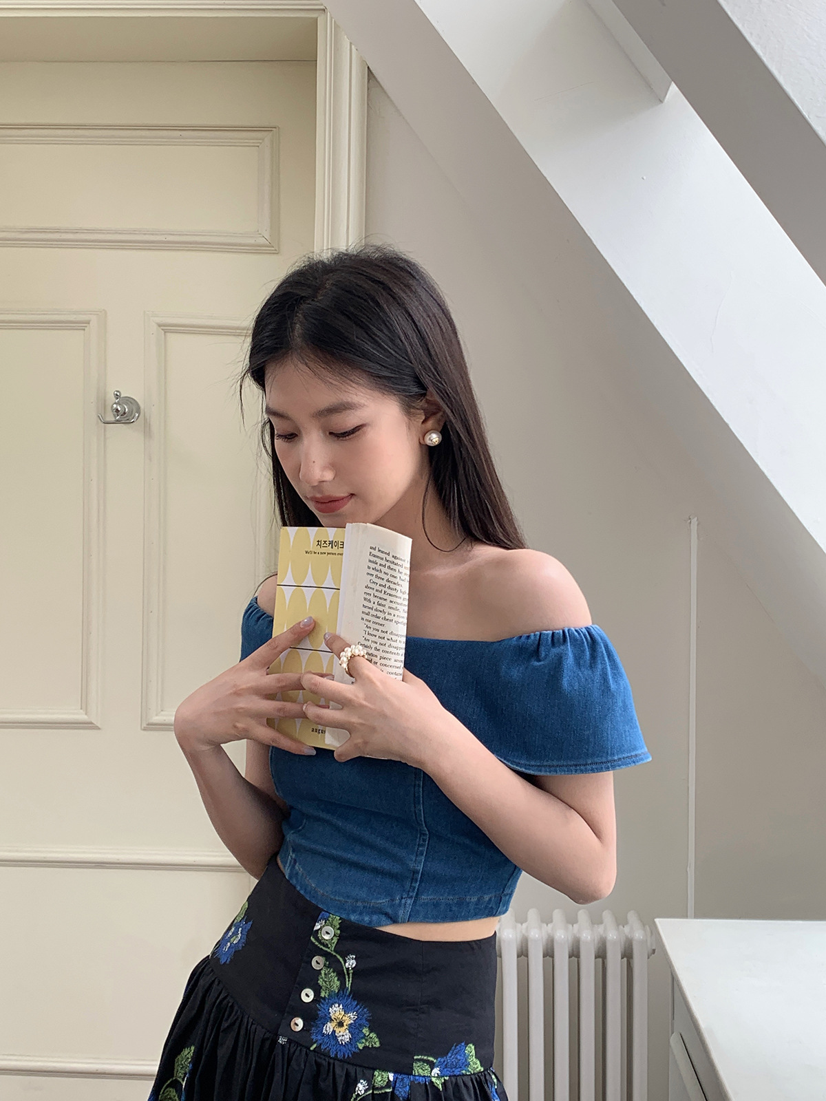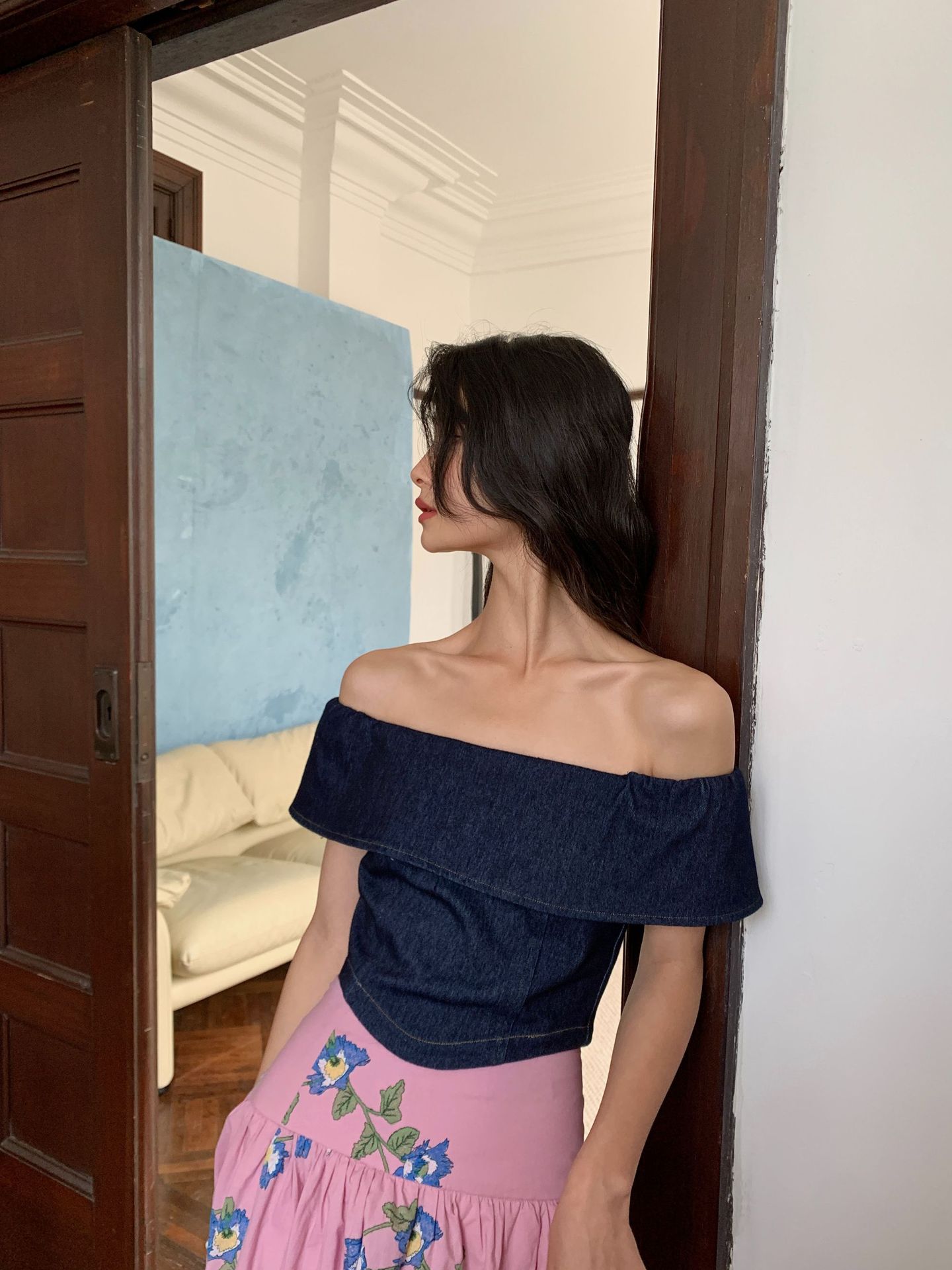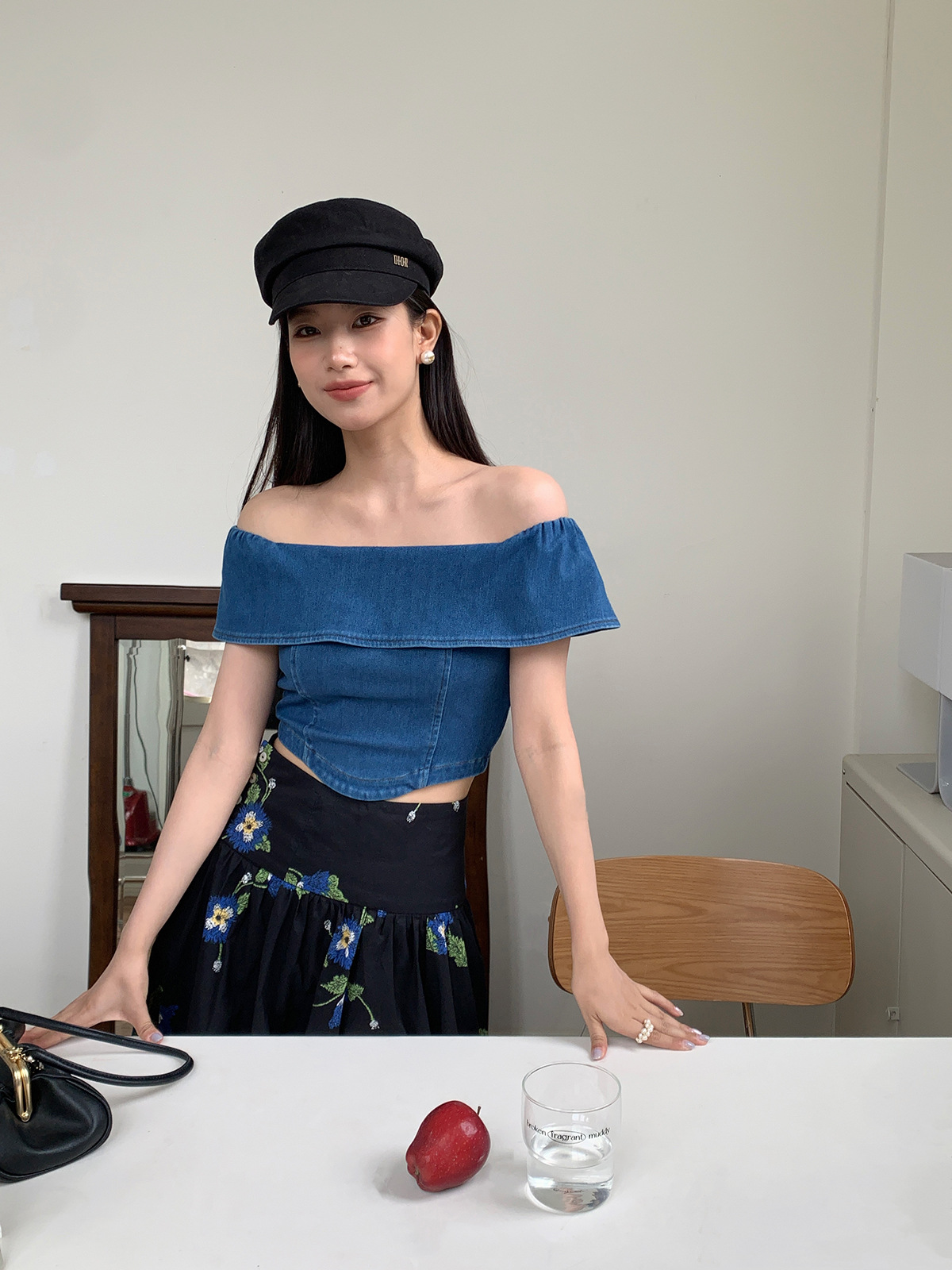 诠释美 NEW OPEN夏牛仔背心女法式荷叶边短款一字肩上衣82620