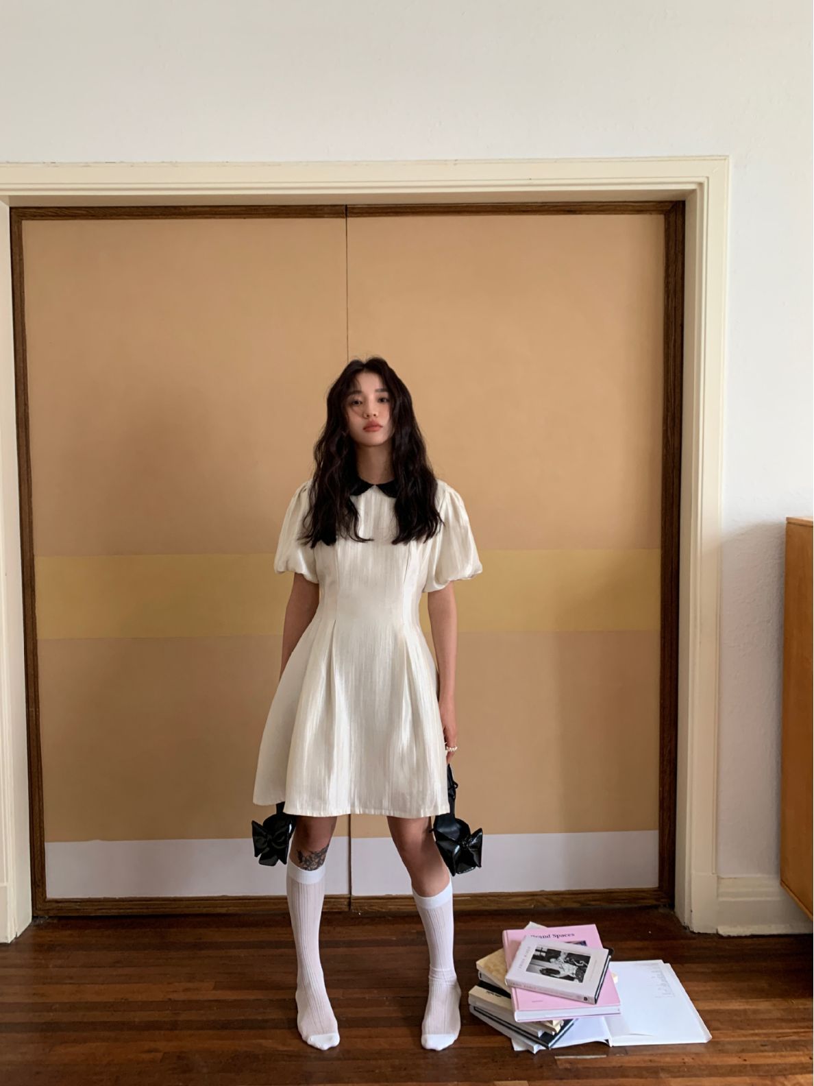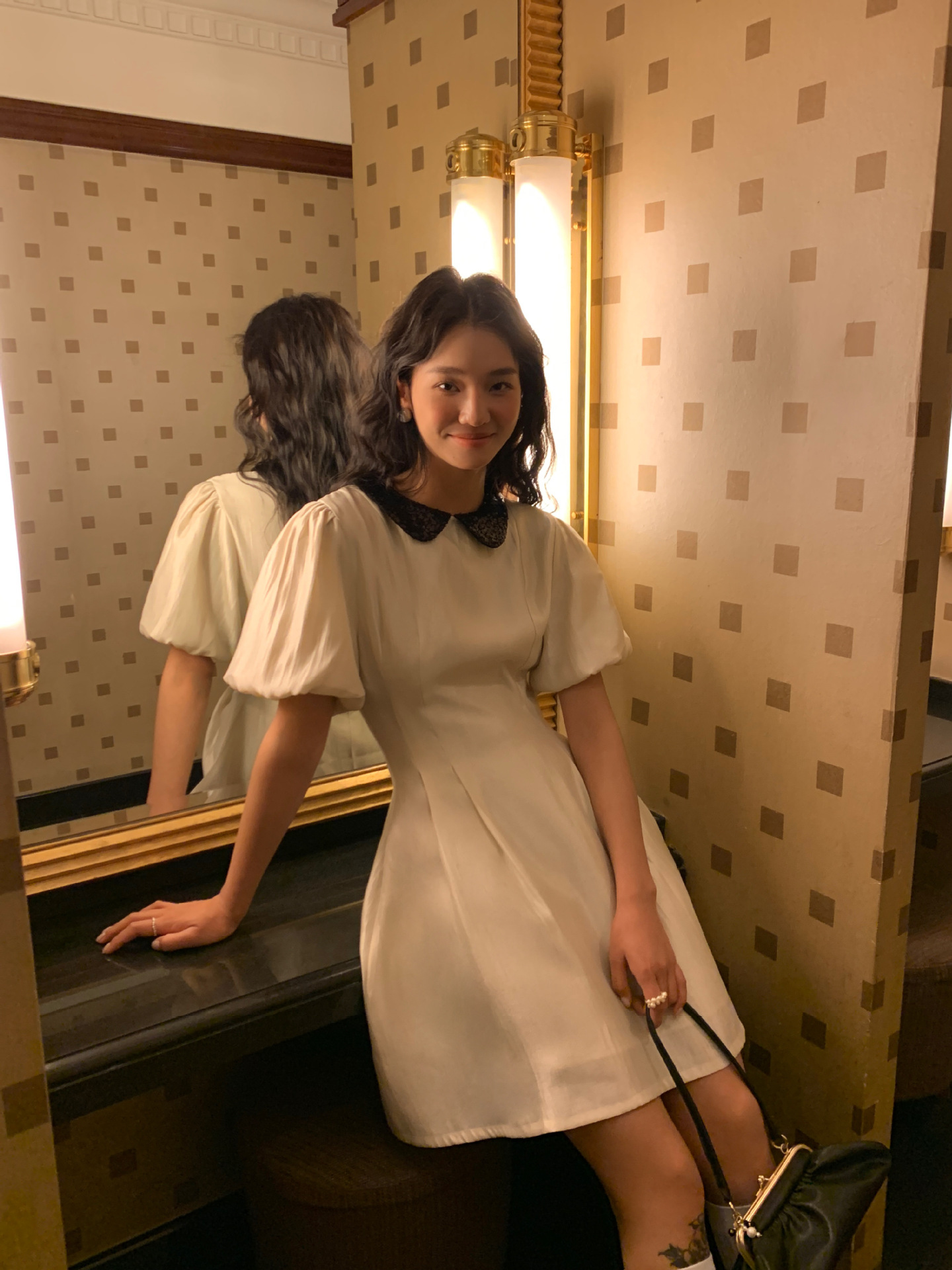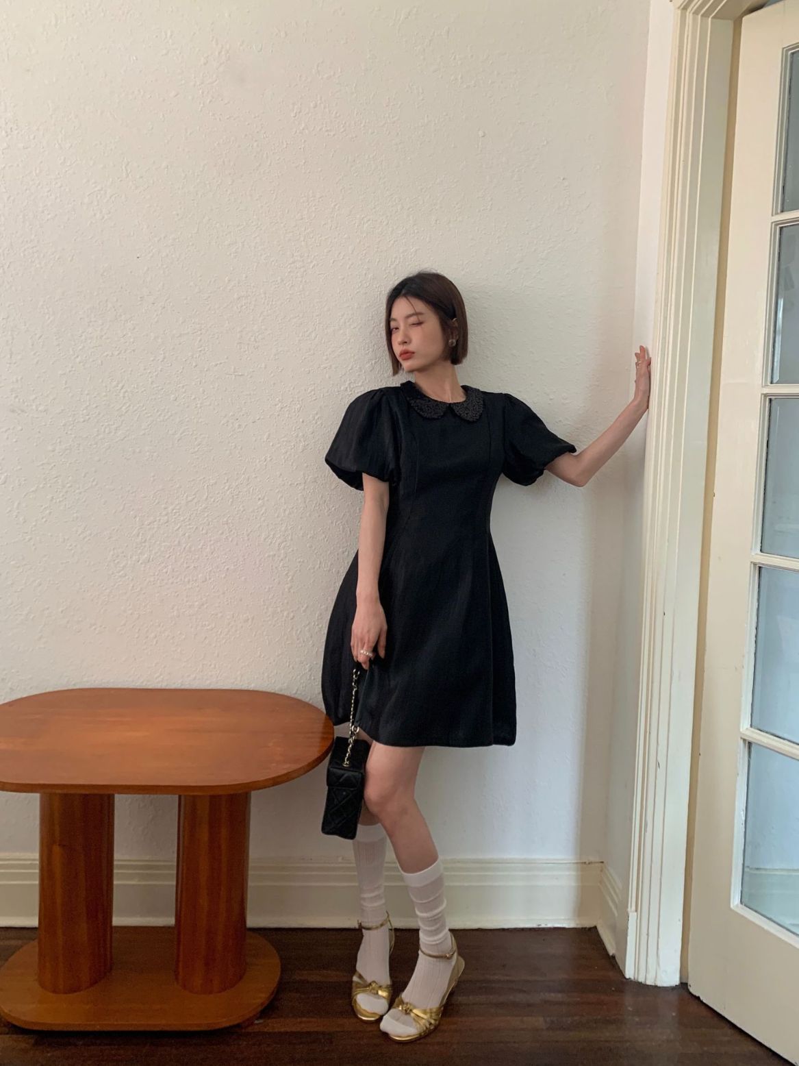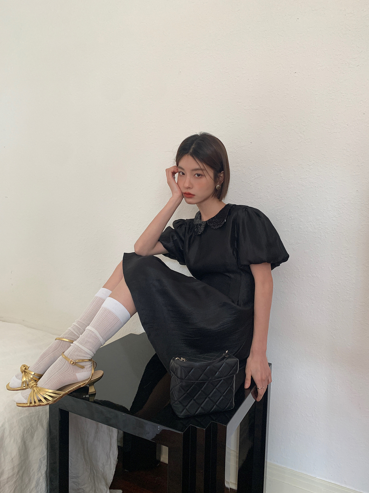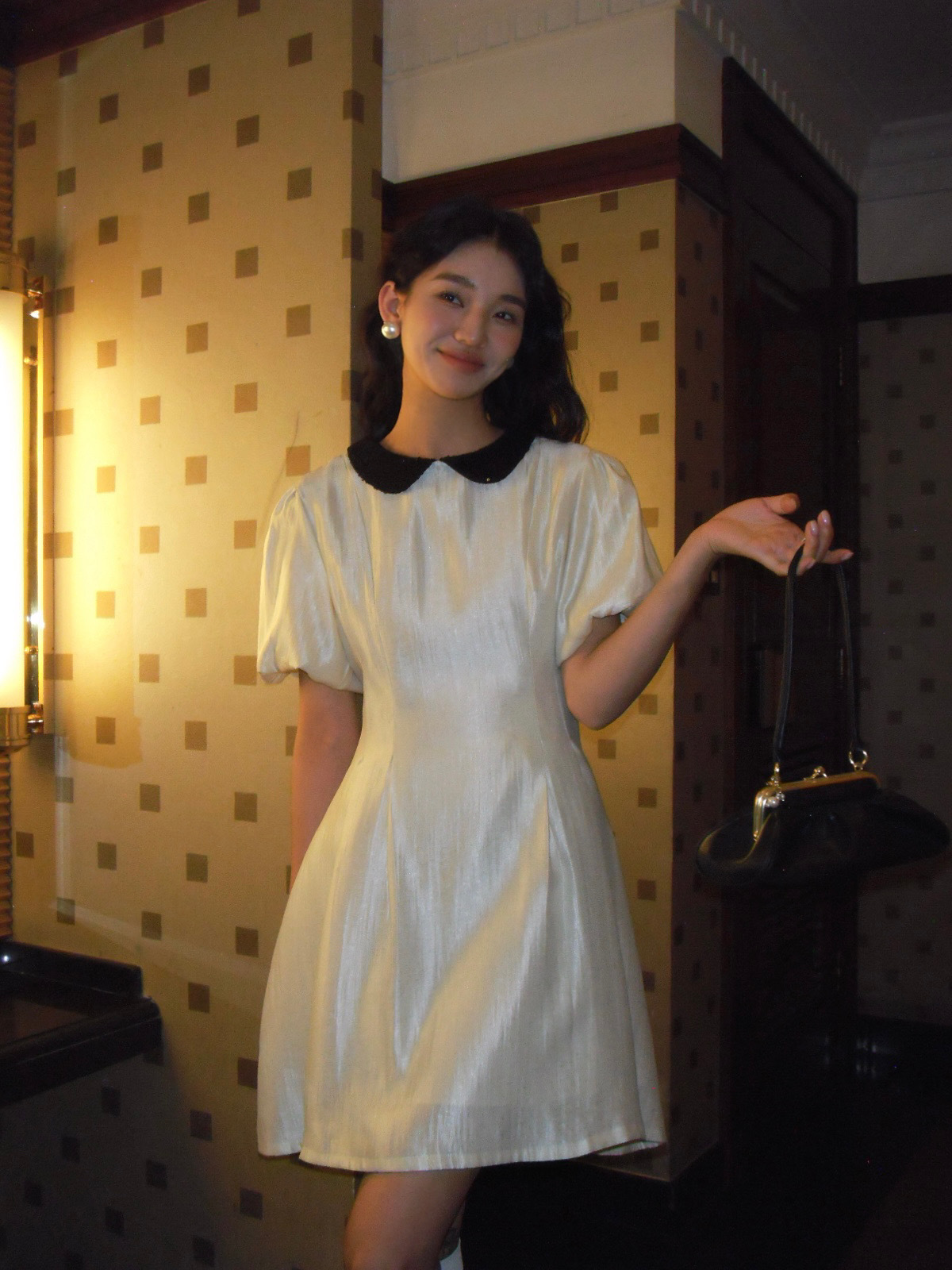诠释美NEW OPEN夏法式娃娃领裙子女收腰气质黑色连衣裙81223