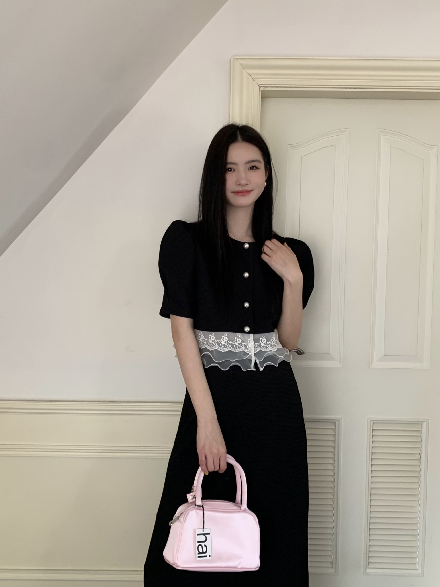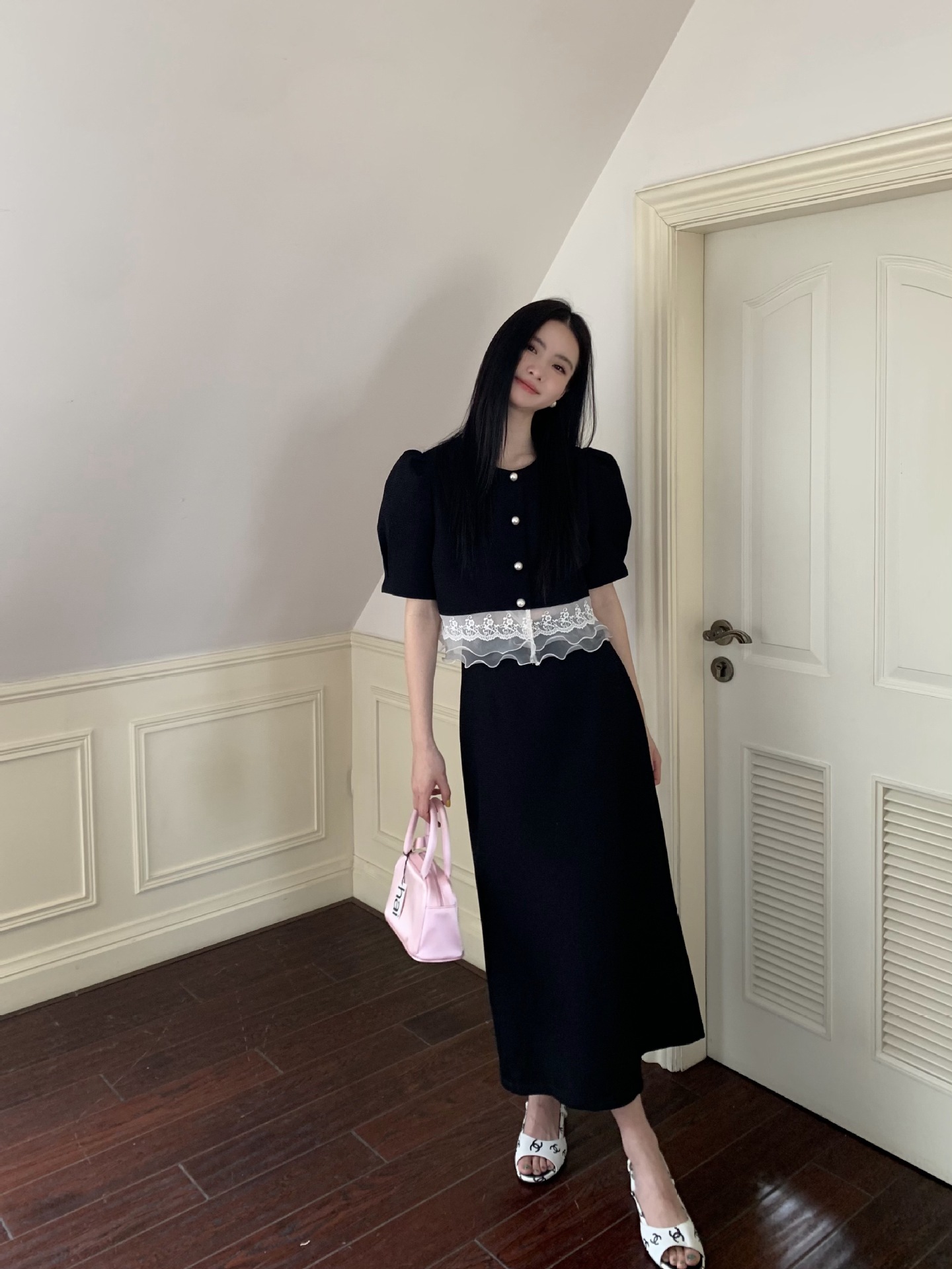 茶歇法式黑色吊带连衣裙女夏季设计感小花背带裙学院赫本风小黑裙