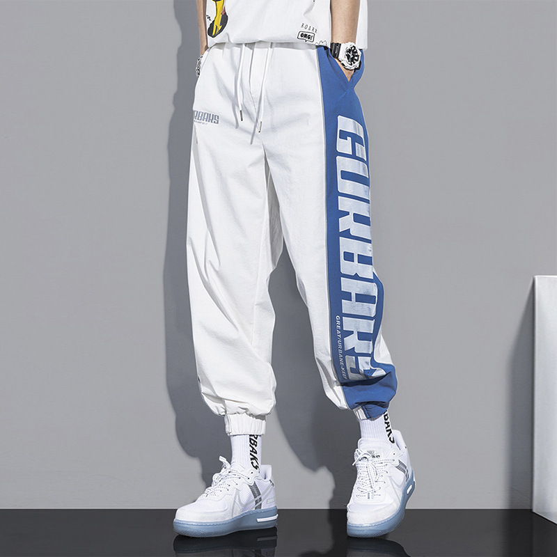 夏季薄款白色休闲运动裤男宽松抽绳束脚拼接撞色港风帅气男生裤子
