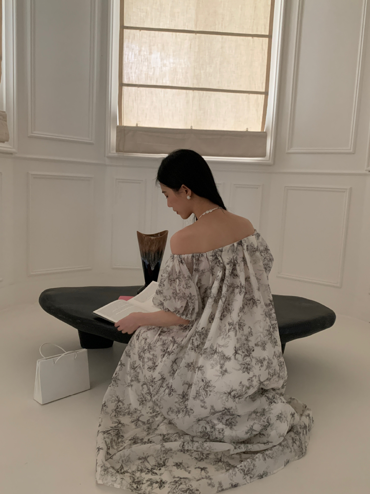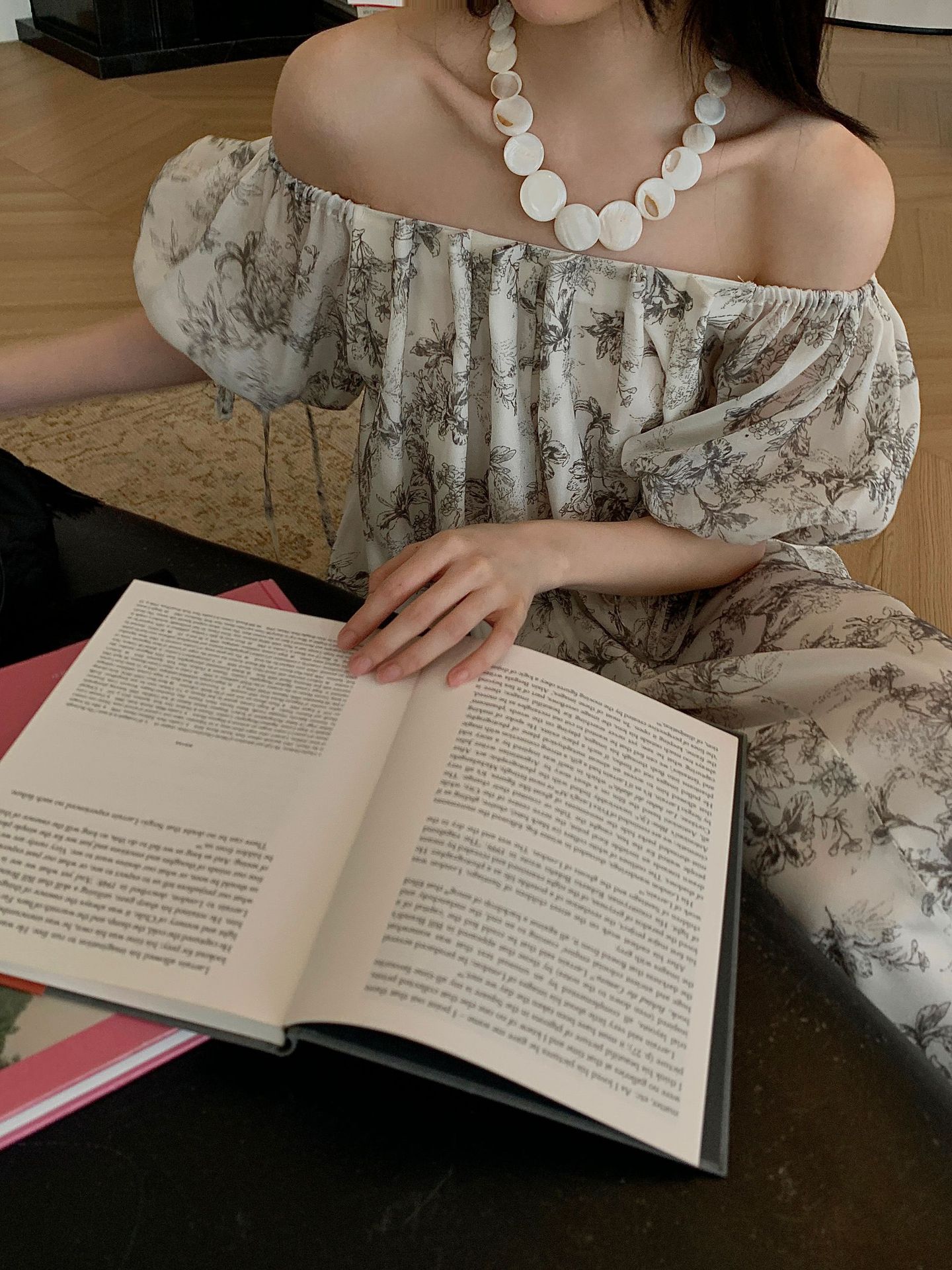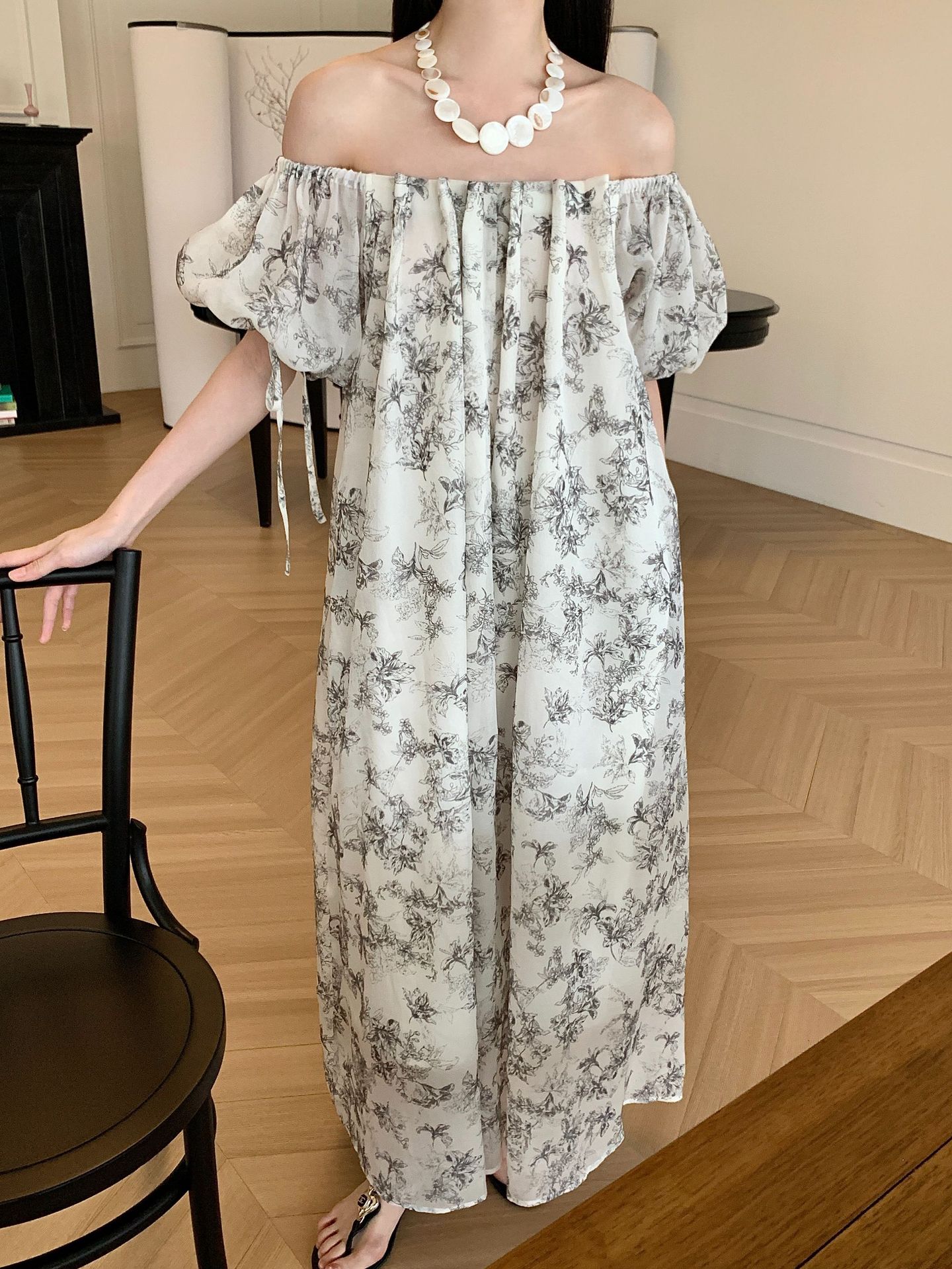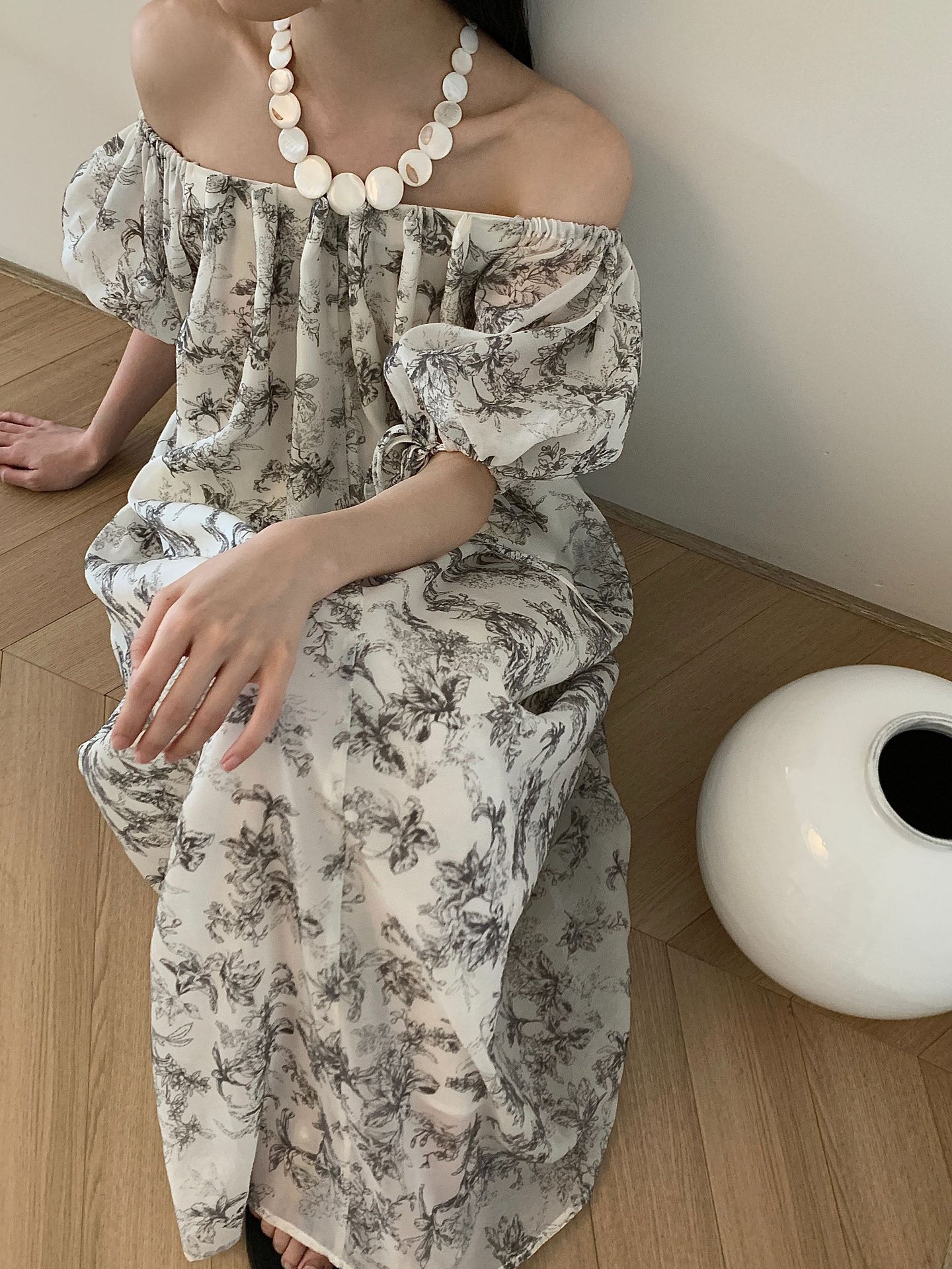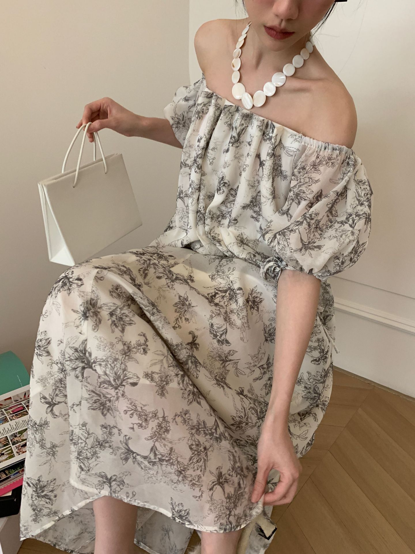 诠释美 NEW OPEN韩系碎花连衣裙女夏季水墨画一字肩长裙82673
