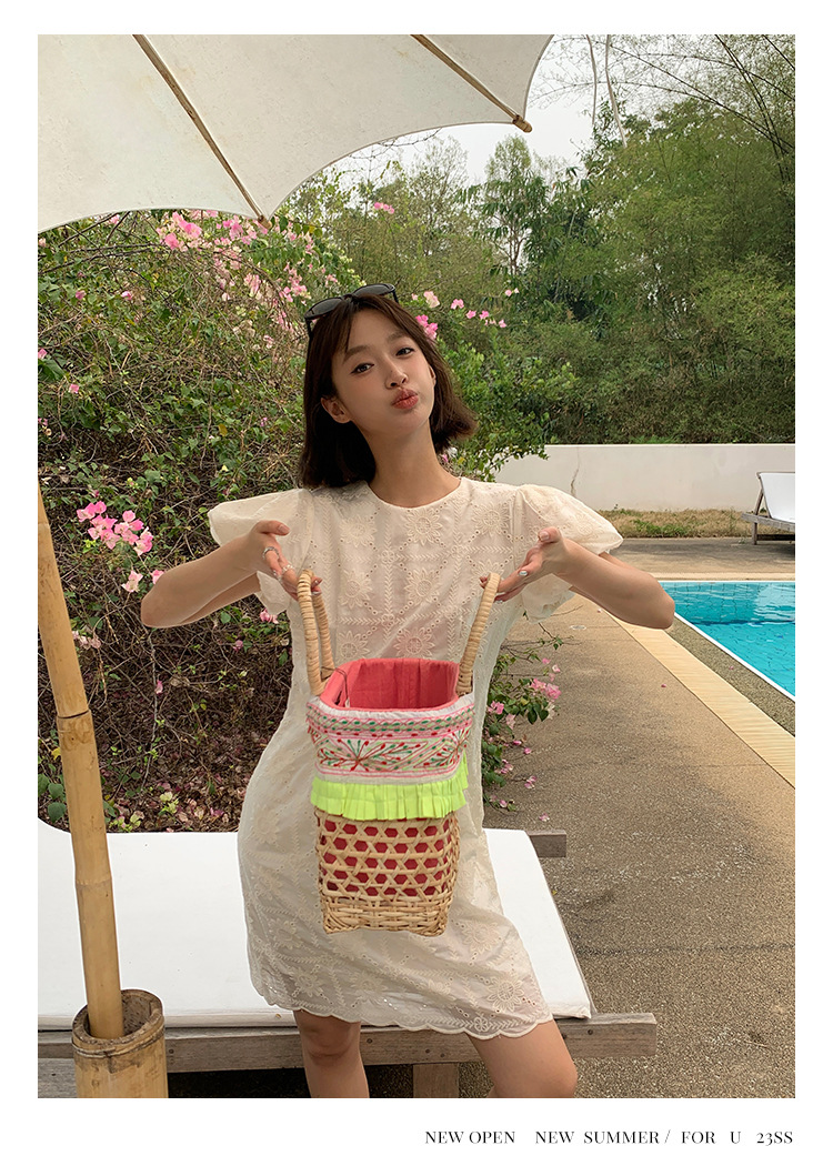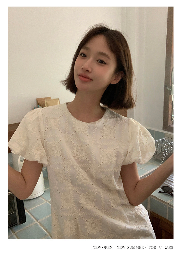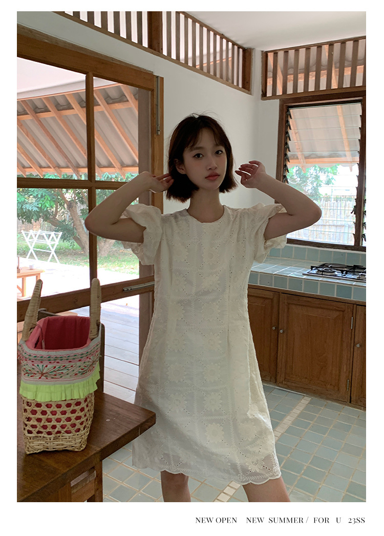 诠释美NEW OPEN连衣裙女夏优雅泡泡袖镂空圆领气质绣花82505