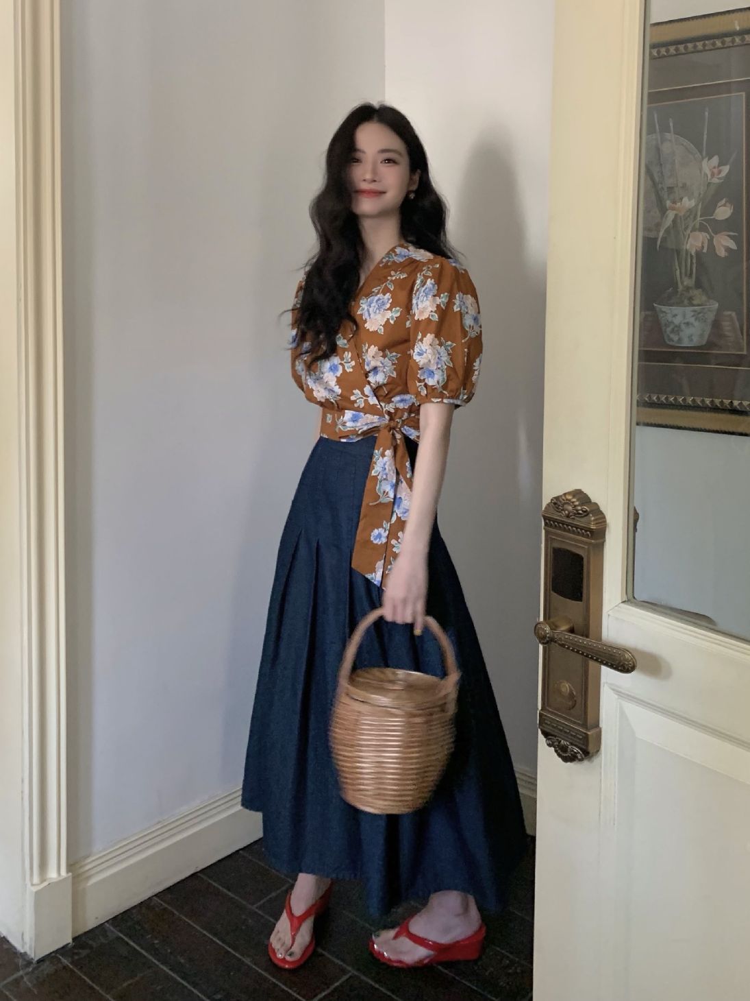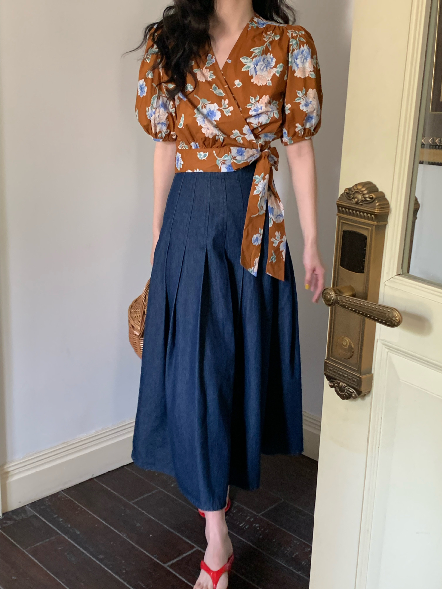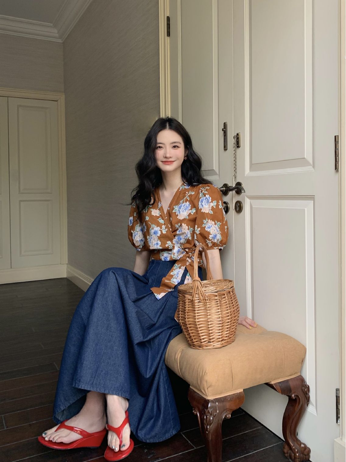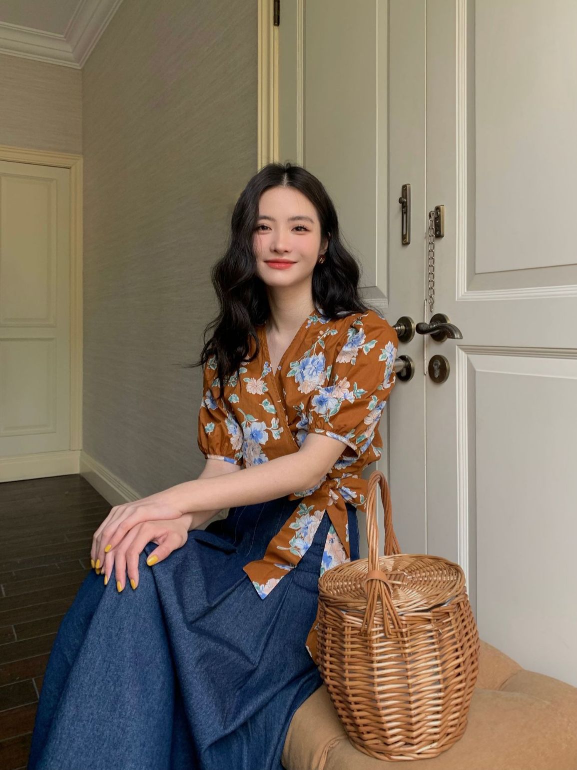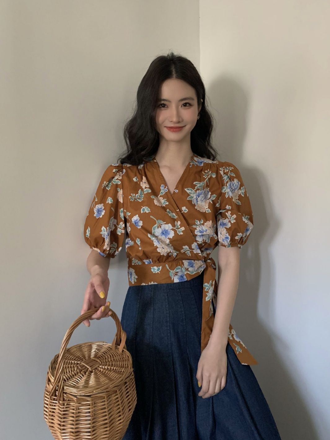 诠释美 NEW OPEN初夏复古小众气质短款绑带收腰碎花小衫81262
