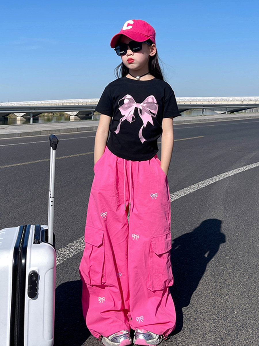 夏女童复古趣味蝴蝶结刺绣休闲长裤阔腿裤童装直筒工装裤跨境