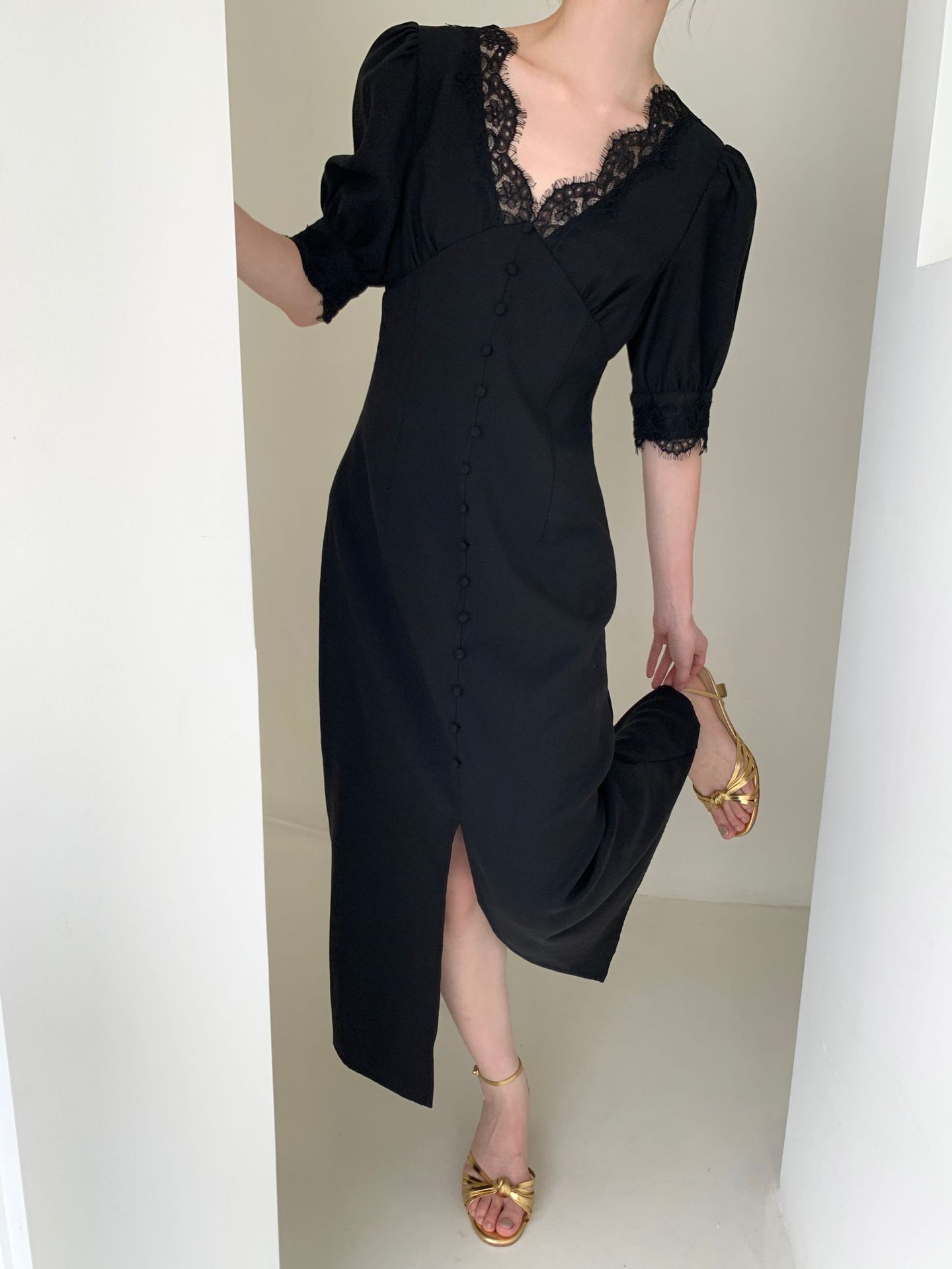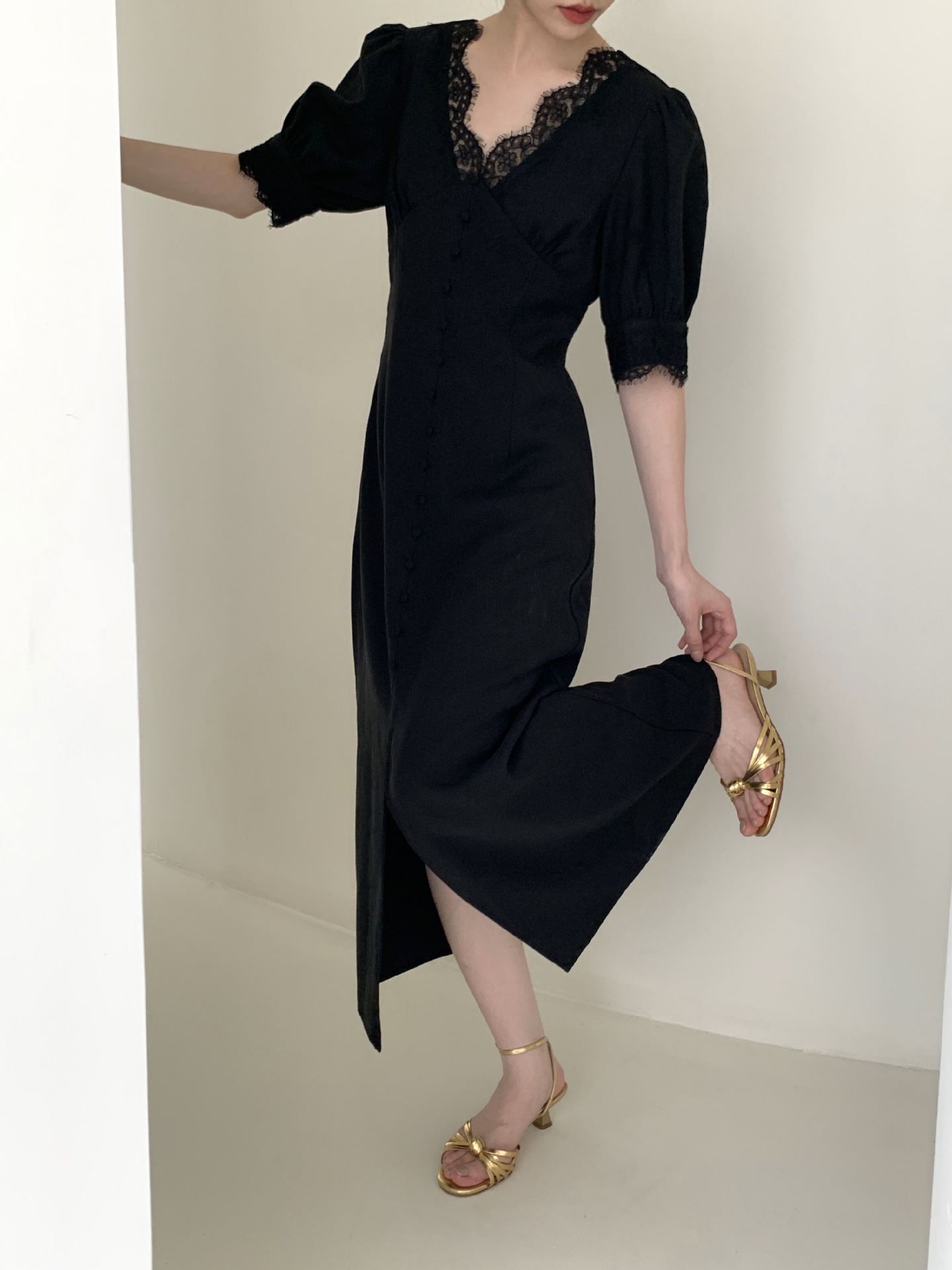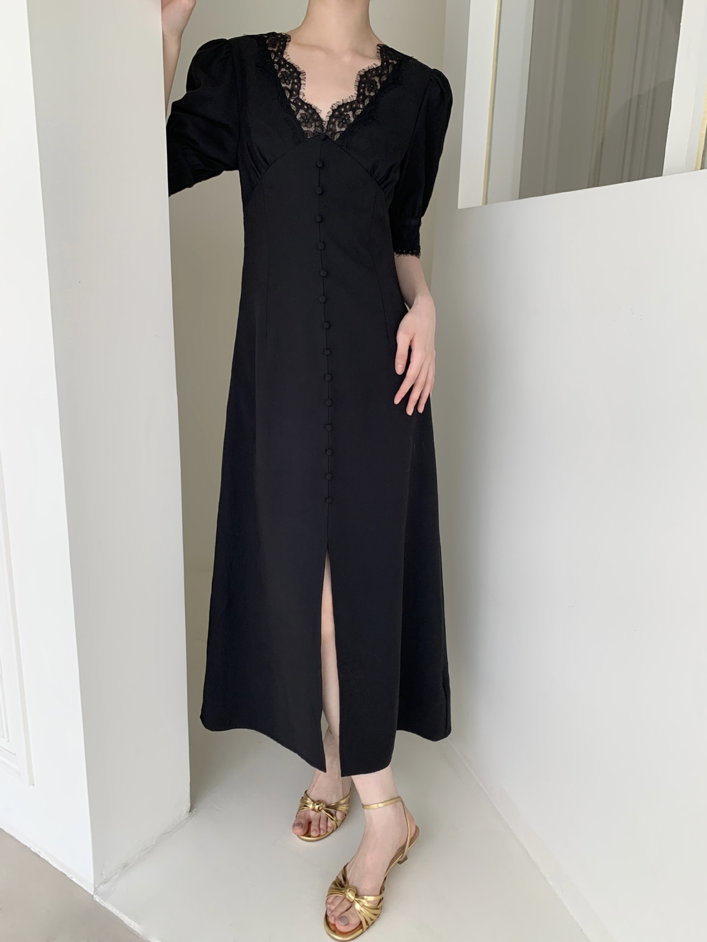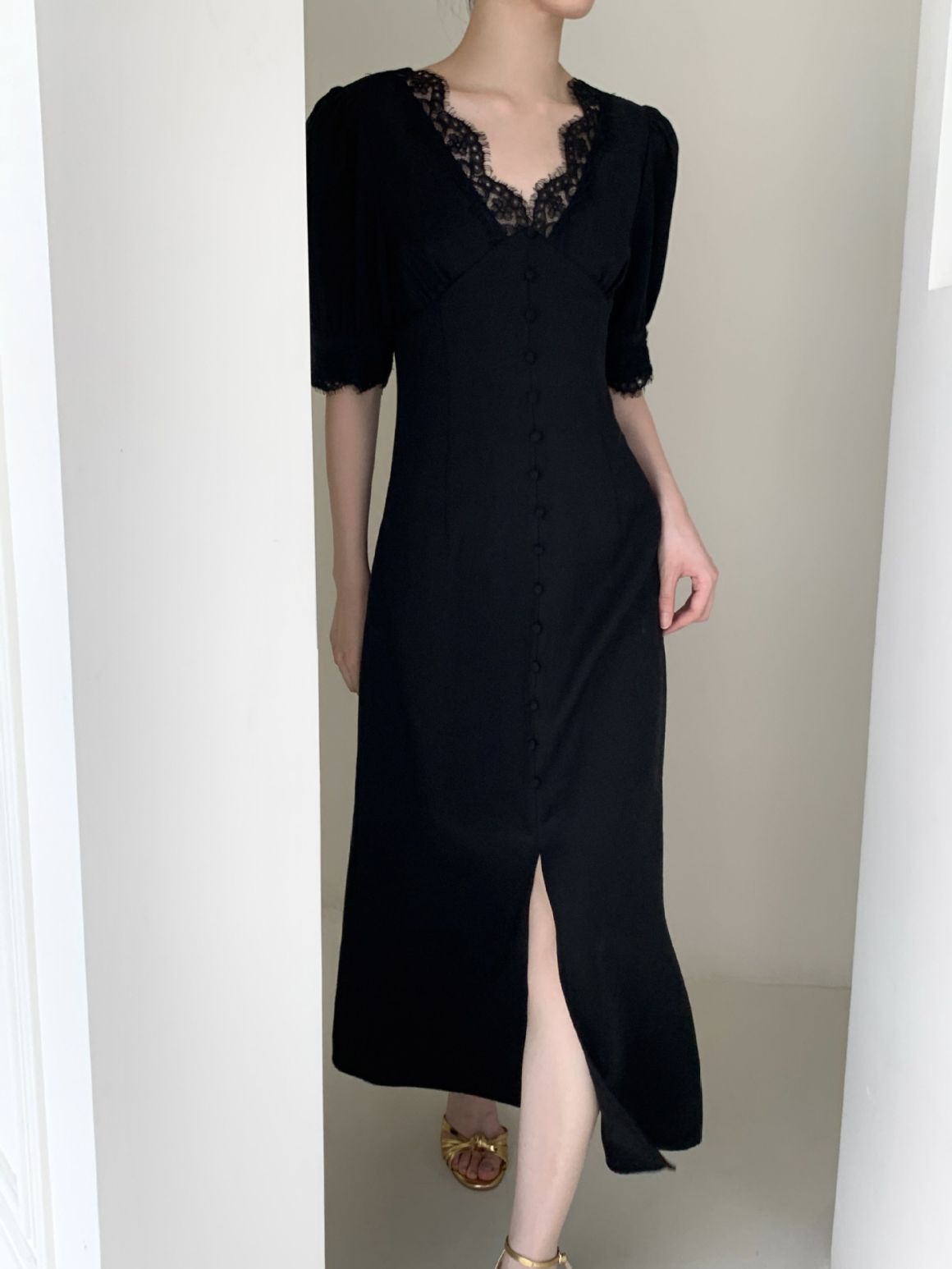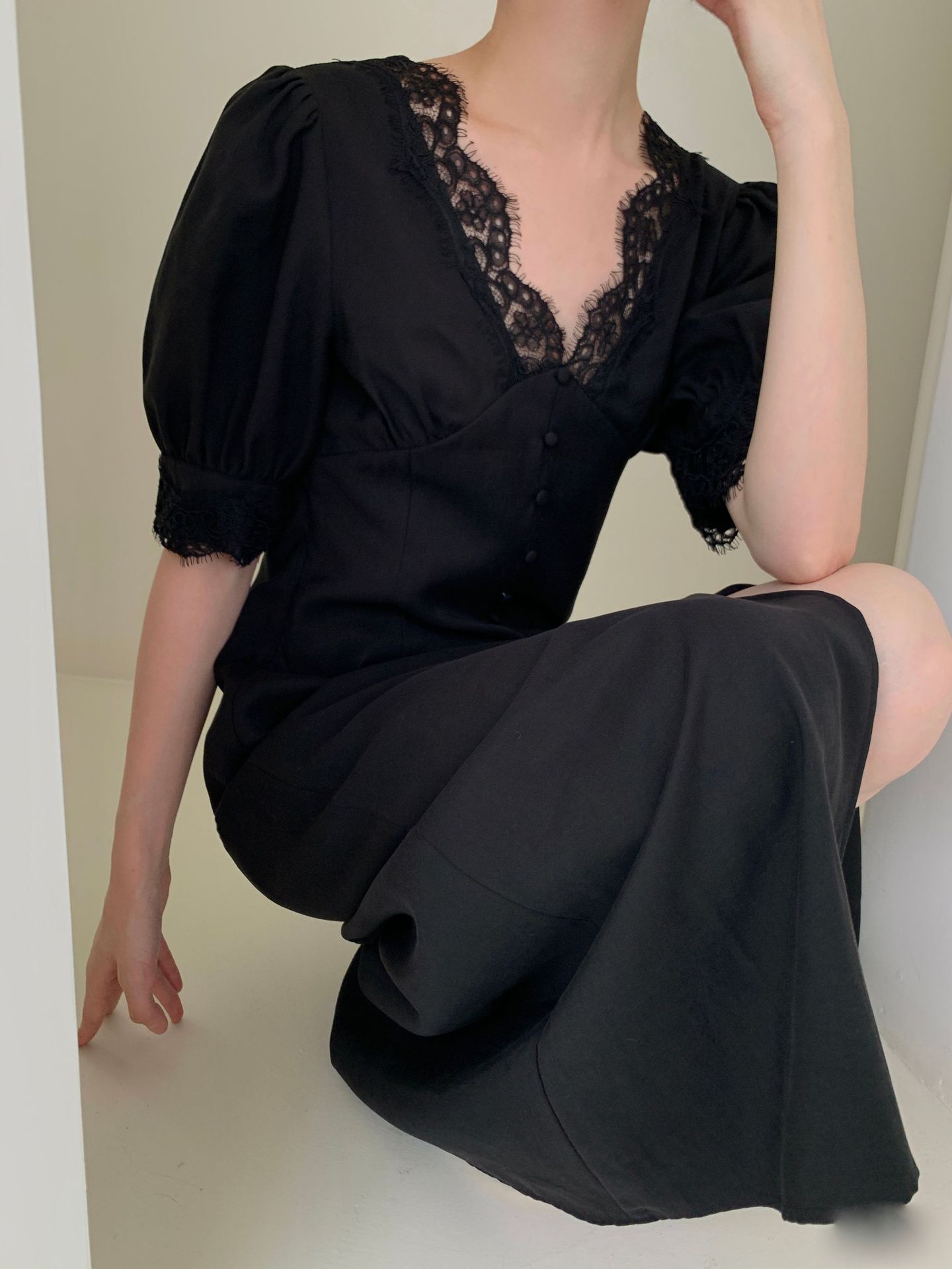 诠释美 NEW OPEN法式赫本黑色连衣裙女夏季蕾丝v领长裙82710