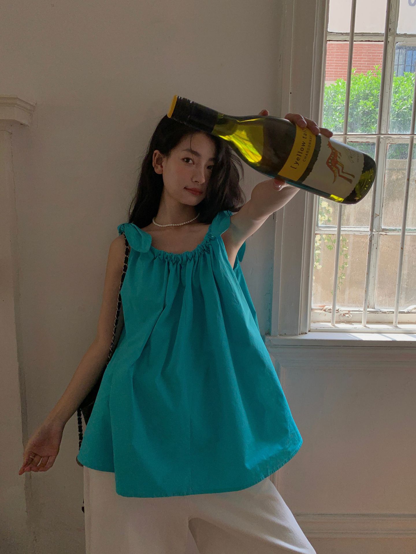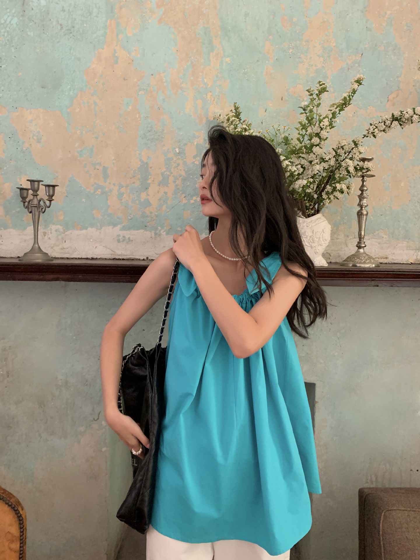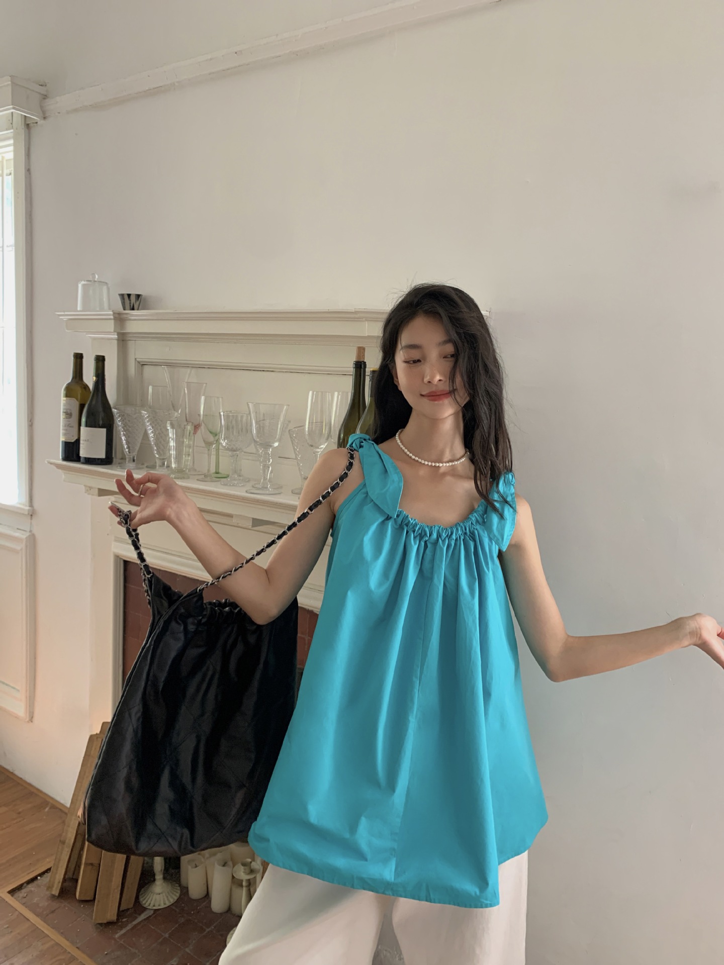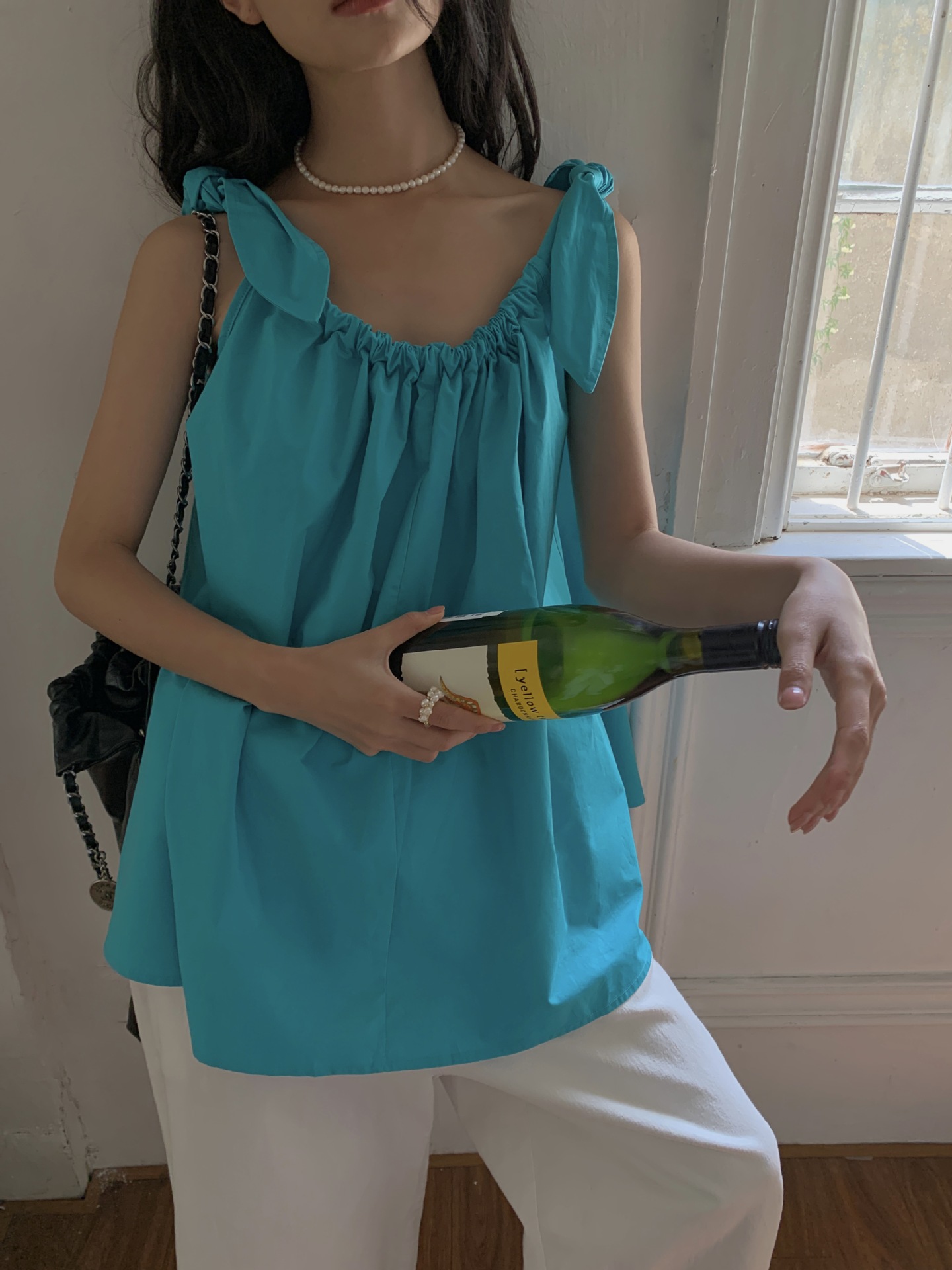 诠释美NEW OPEN甜美减龄衬衫女夏设计褶皱肩带无袖上衣82579