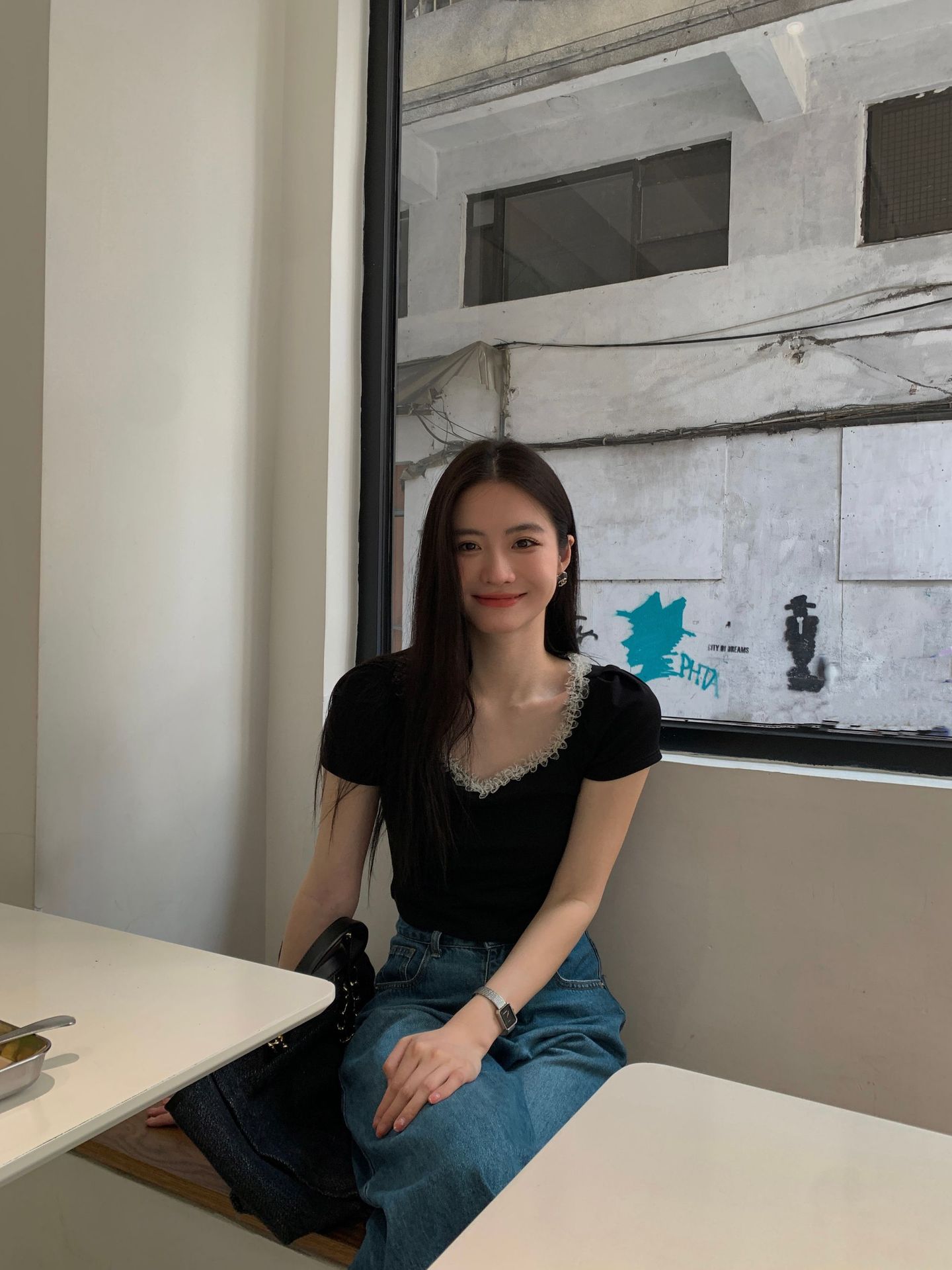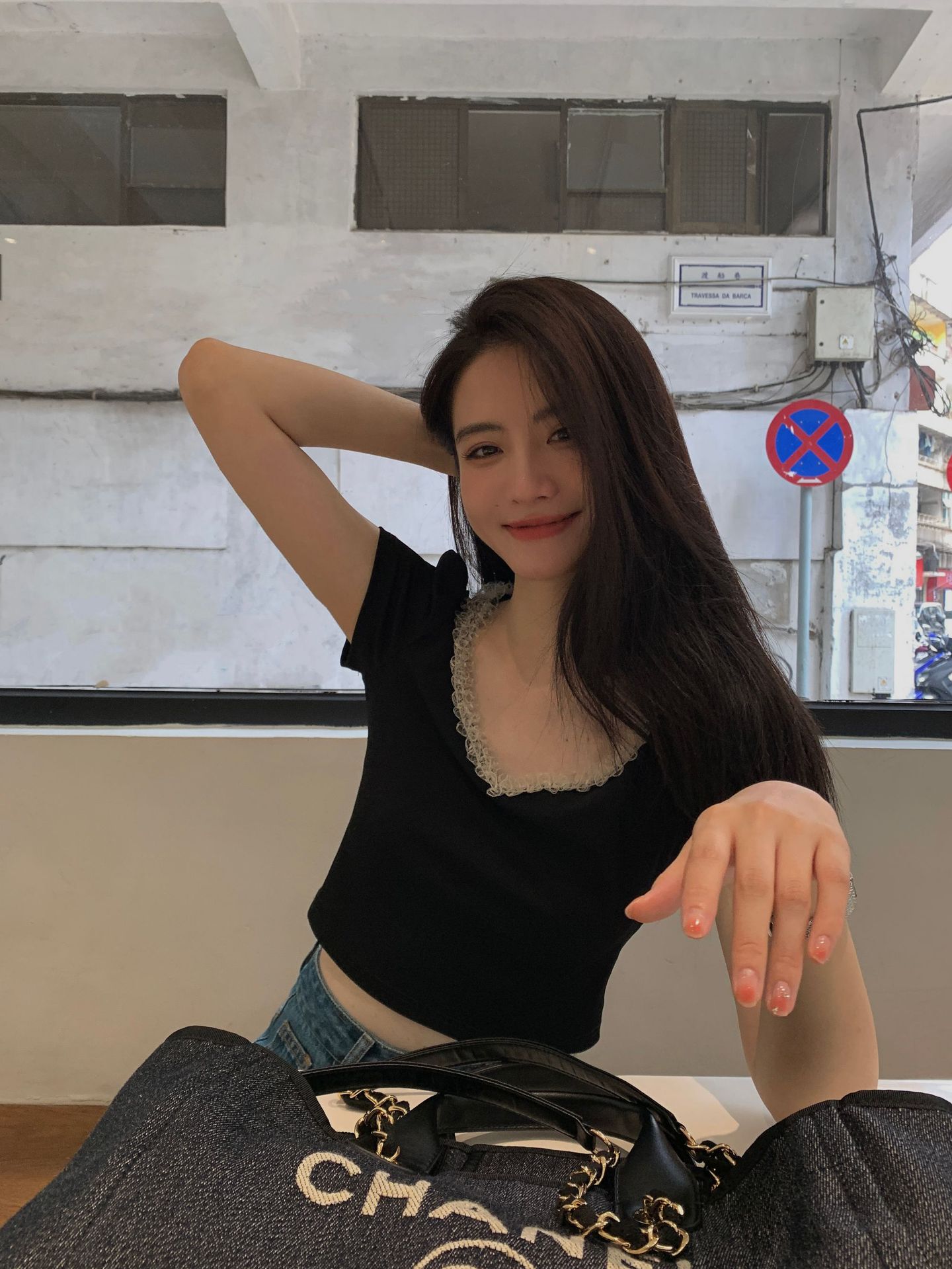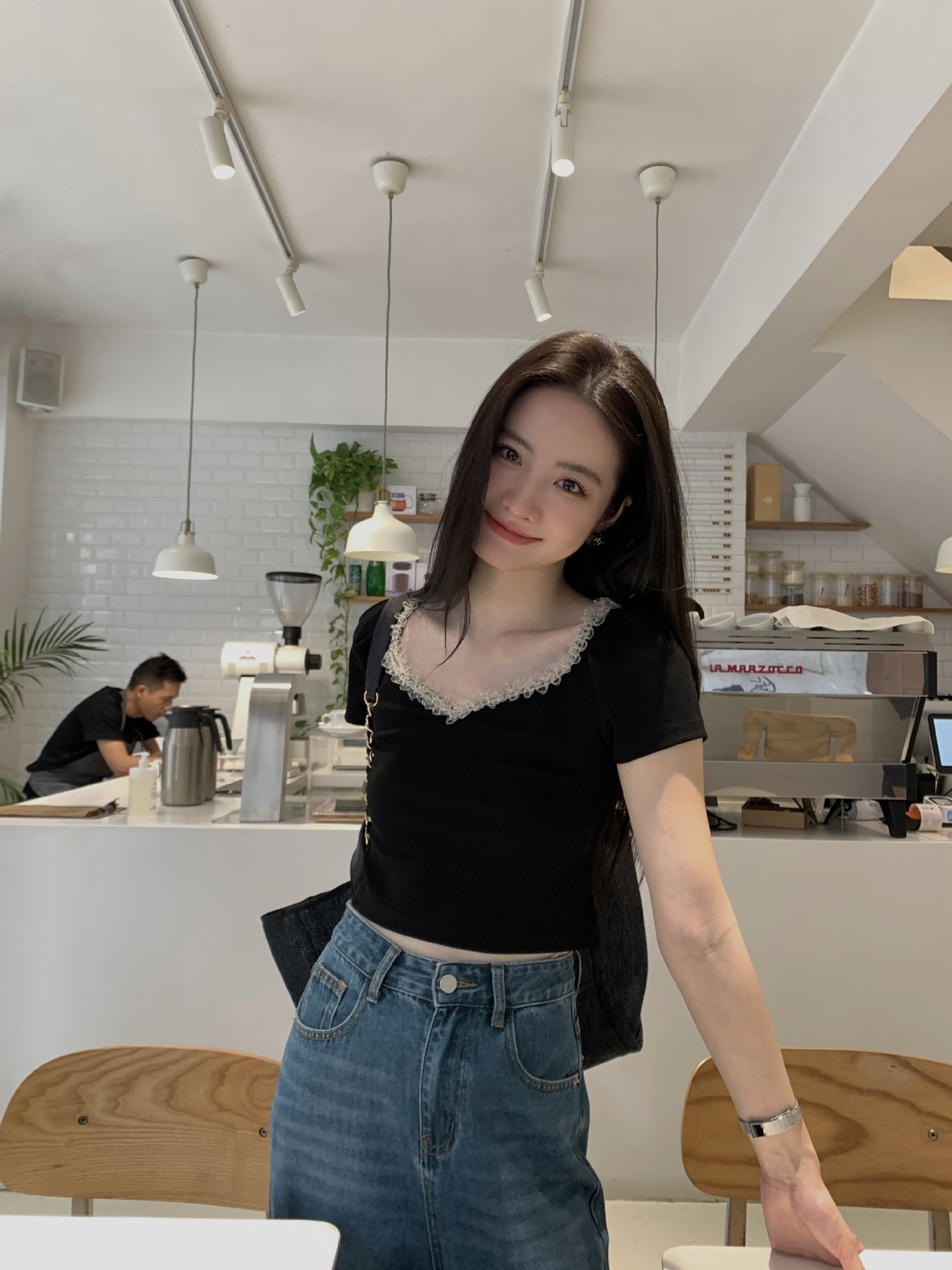 清仓不退不换黑色t恤女短袖夏季法式v领修身小上衣82238