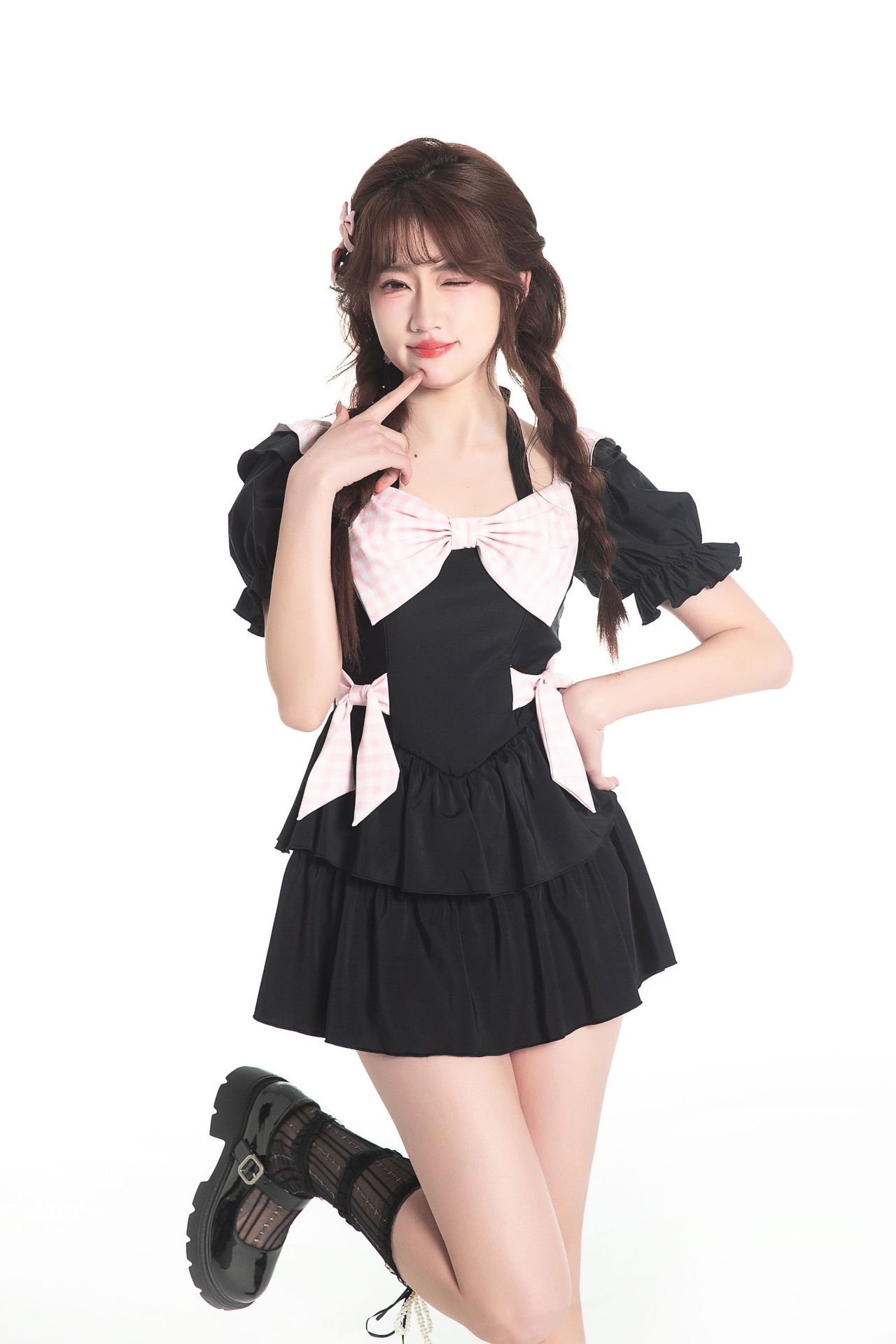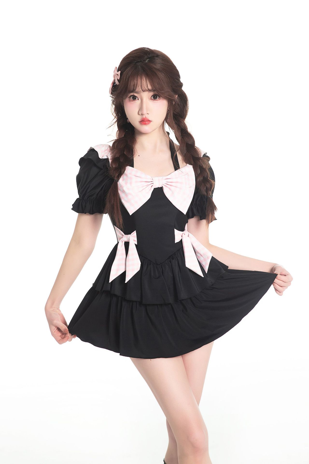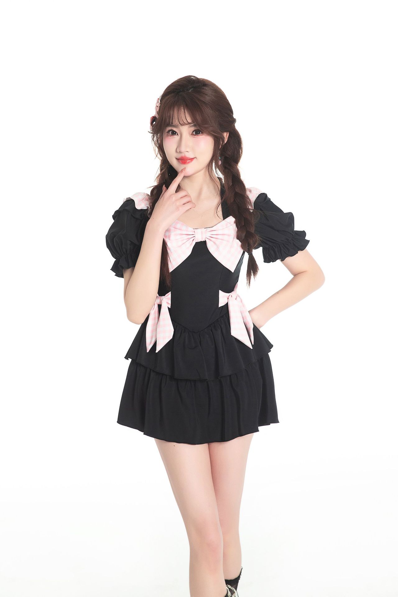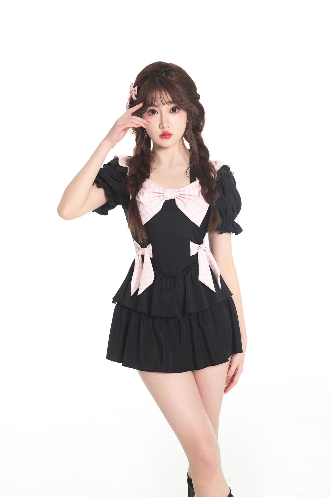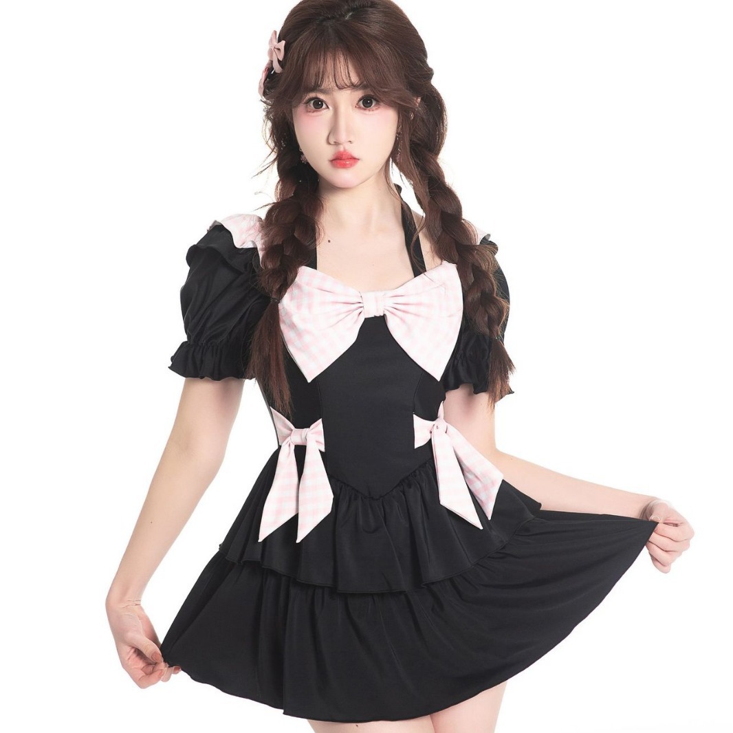 日系游泳衣女夏新款保守学生少女连体裙式蝴蝶结甜美女孩泳装