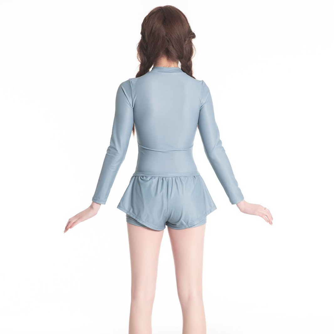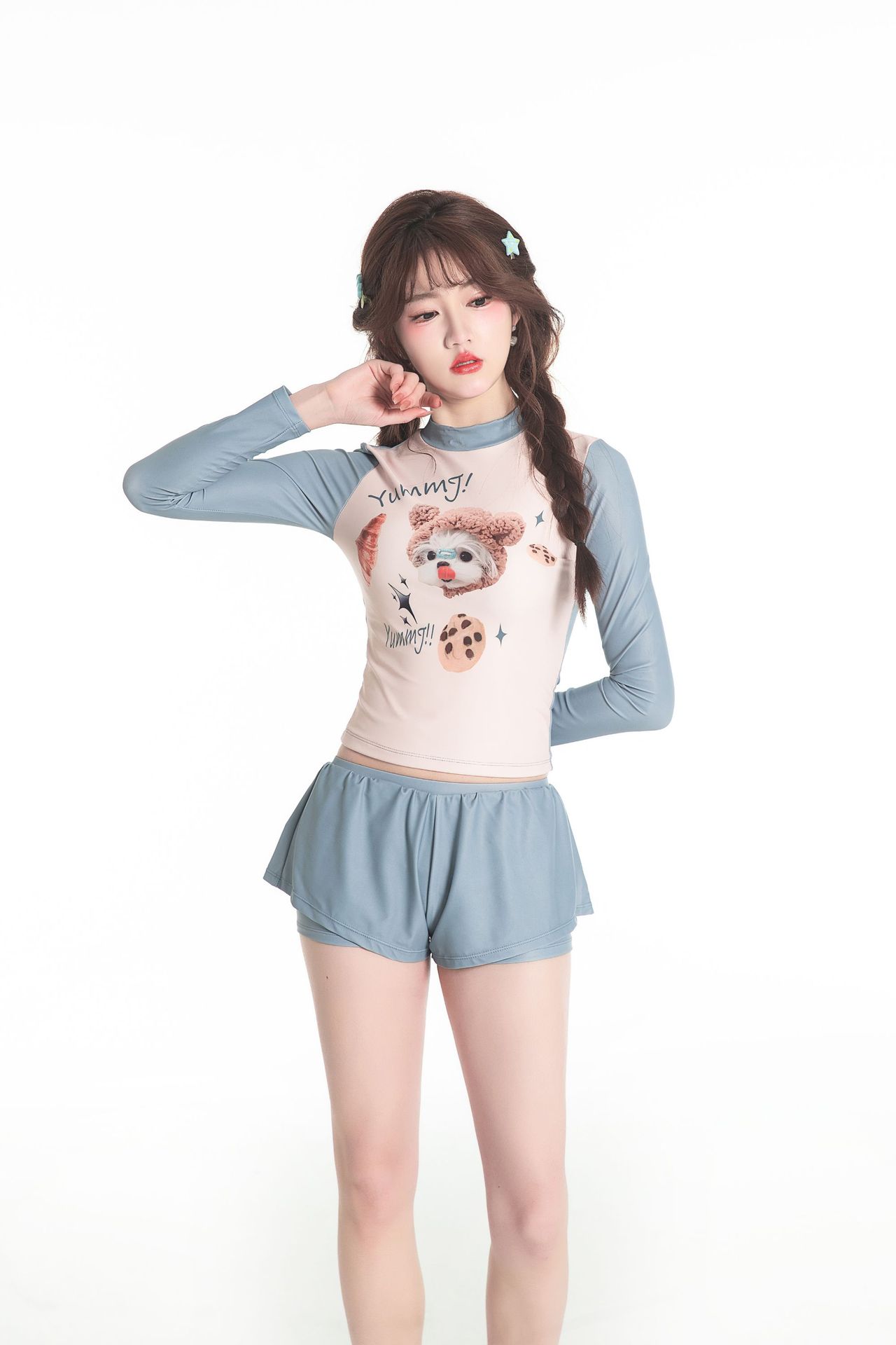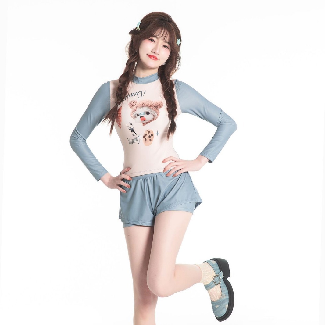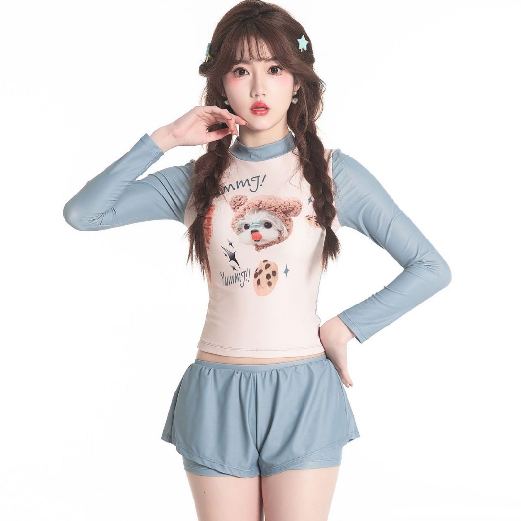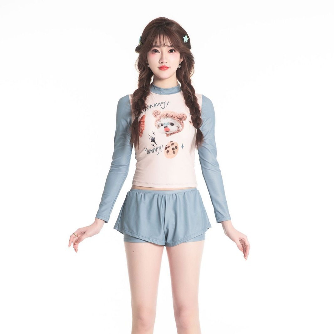 元气少女卡通印花泳衣女夏短款修身显瘦泳装保守海边度假长袖泳衣