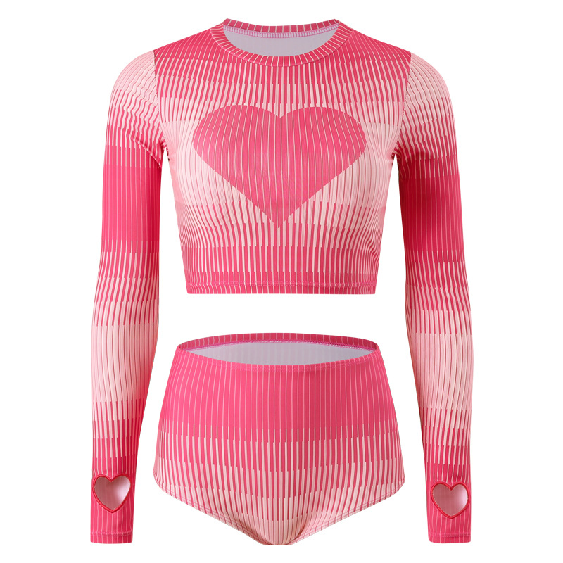 轻奢简约可爱少女心形长袖泳衣紧身圆领保守高腰露脐分体游泳衣女