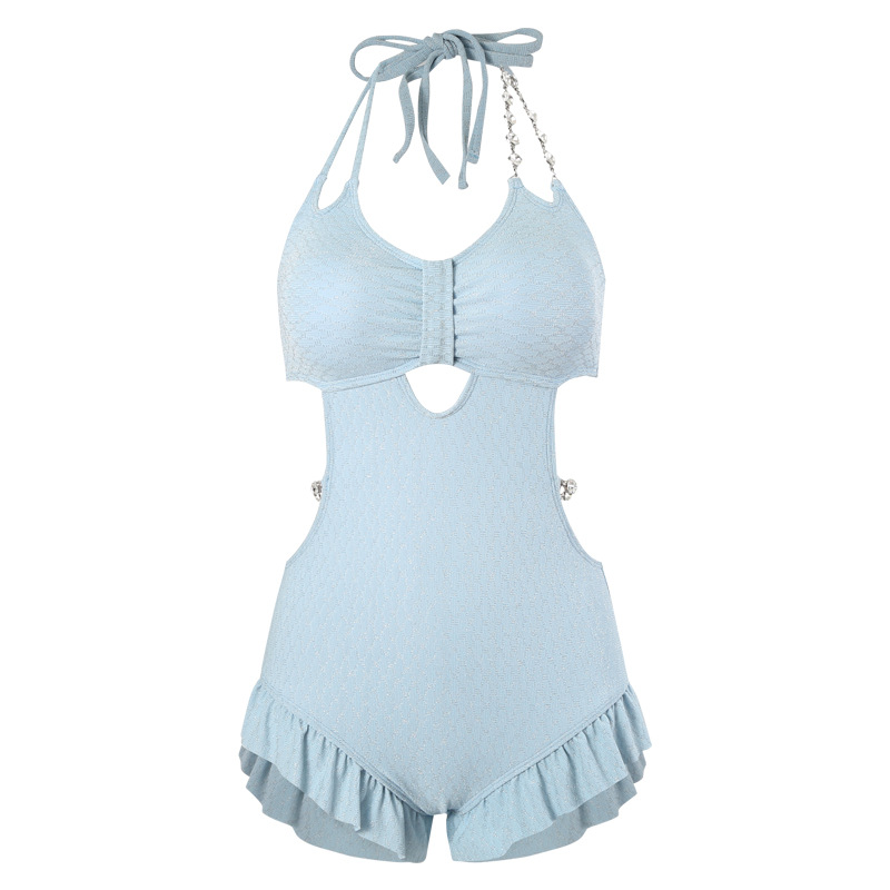 新款泳衣女连体性感三角荷叶边纯欲风辣妹挂脖系绳式游泳衣女