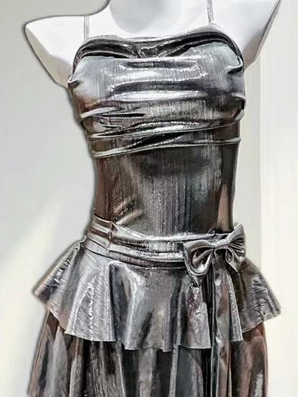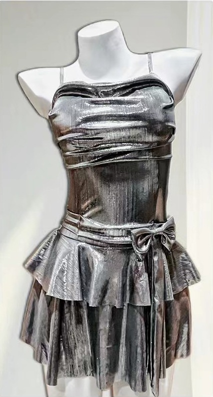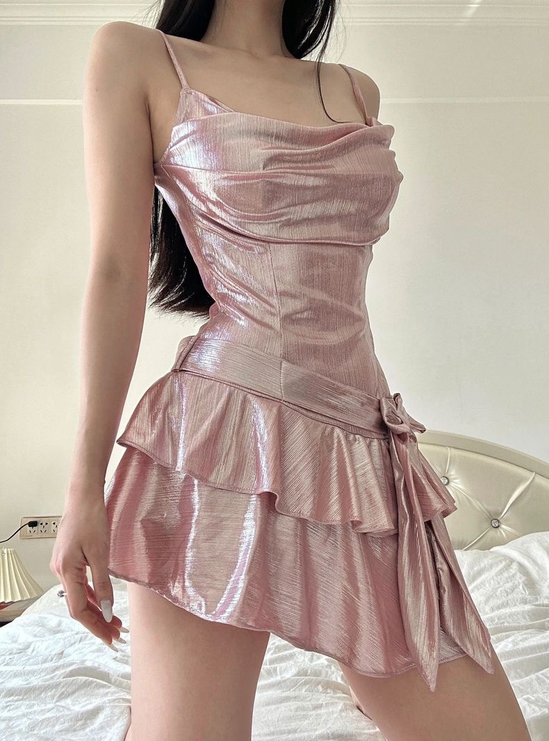 24新款泳衣女辣妹性感不规则荷叶边吊连体女粉色亮面修身百褶泳装