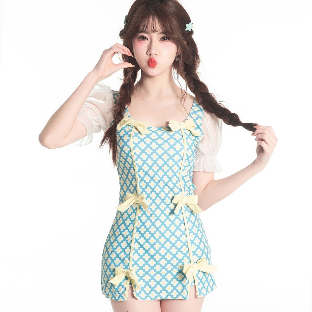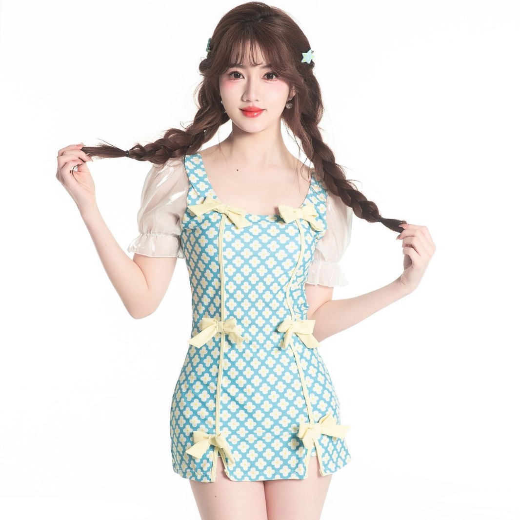 甜美可爱仙女纯欲风泳衣小香风薄纱泡泡袖蝴蝶结修身连体裙式泳衣
