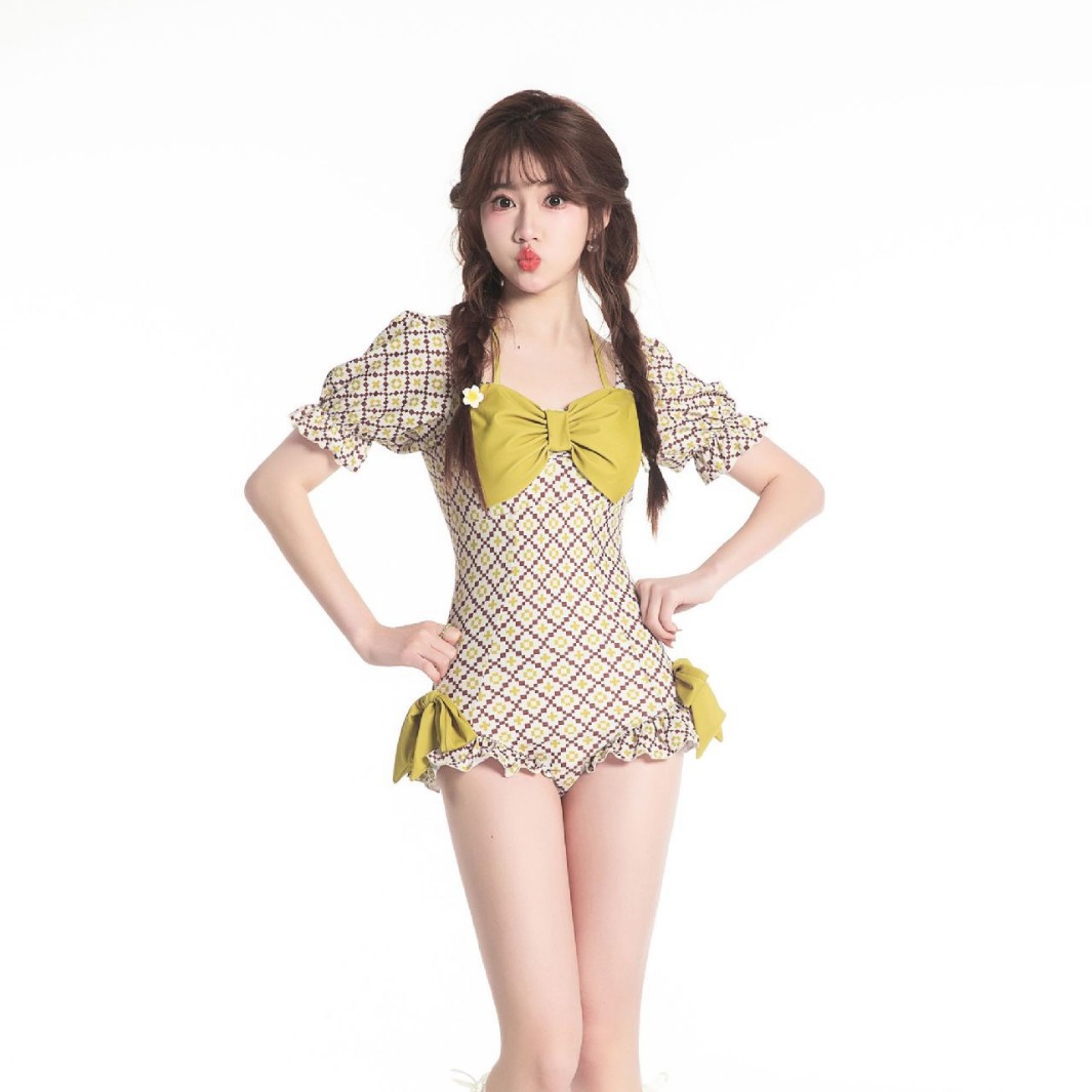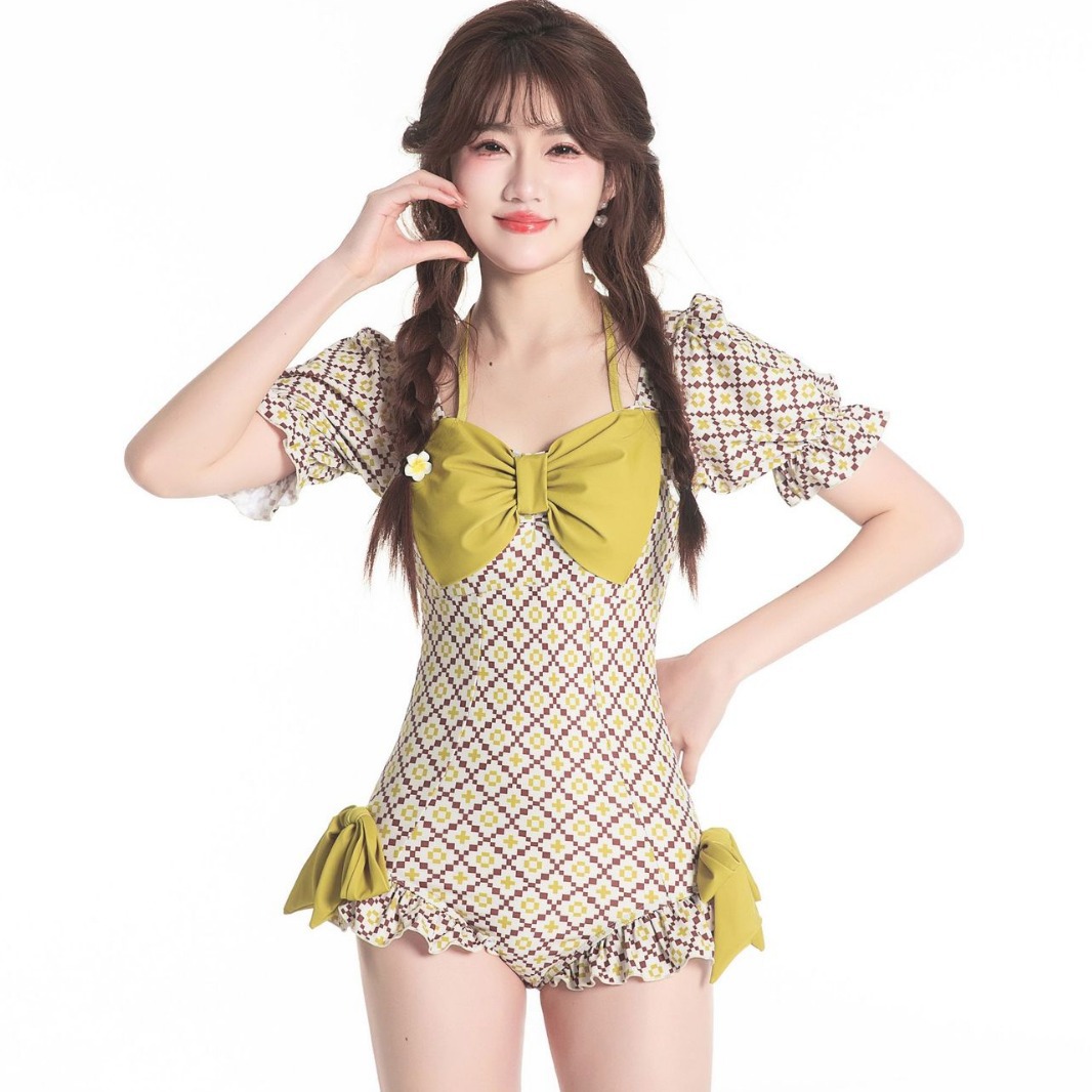 新款复古格子可爱蝴蝶结泳衣紧身泡泡袖保守三角修身显瘦连体泳衣