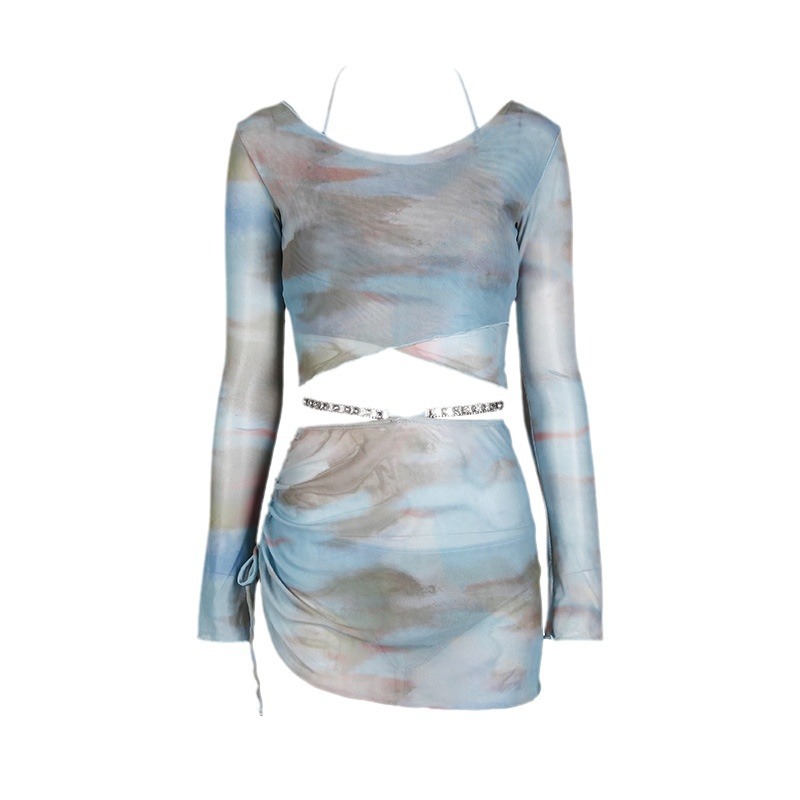 新款超仙分体裙式泳衣四件套钻链高级感扎染修身显瘦遮肉游泳衣女