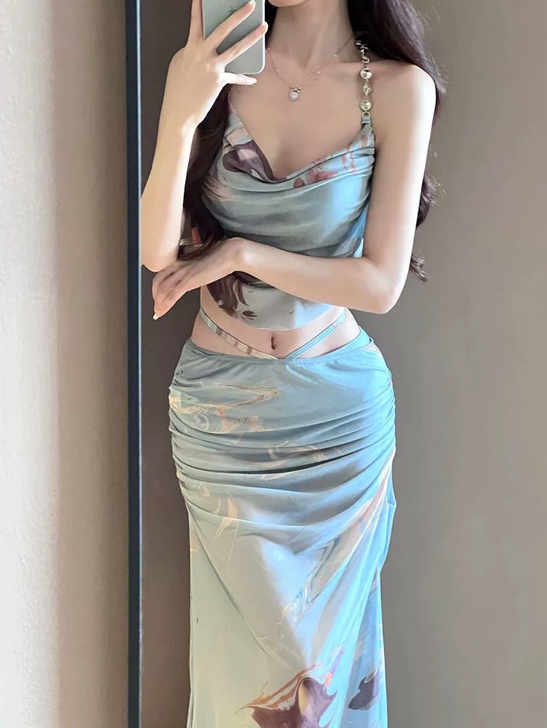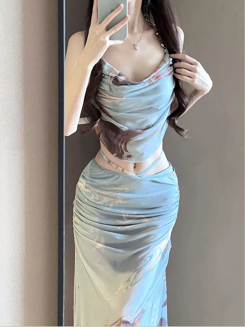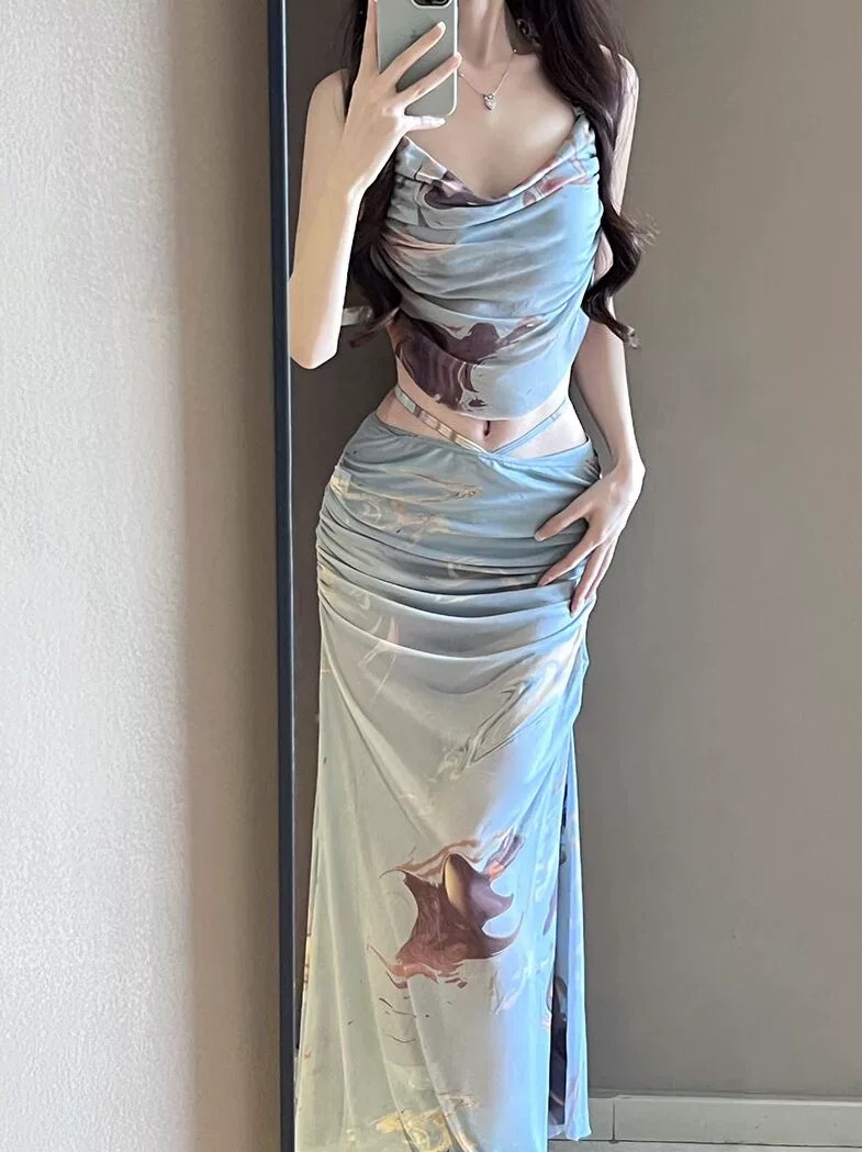 新中式【墨染年华】水墨印花中长款开叉半身裙女三宅褶皱裙