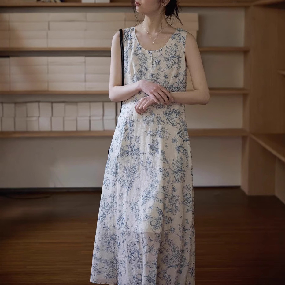 自然感手绘印花飘逸无袖背心连衣裙法式裙子女夏