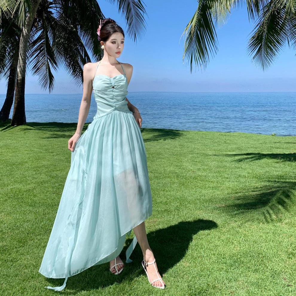 薄荷绿度假氛围感挂脖仙气美背蝴蝶结性感露背连衣裙长裙海岛裙子