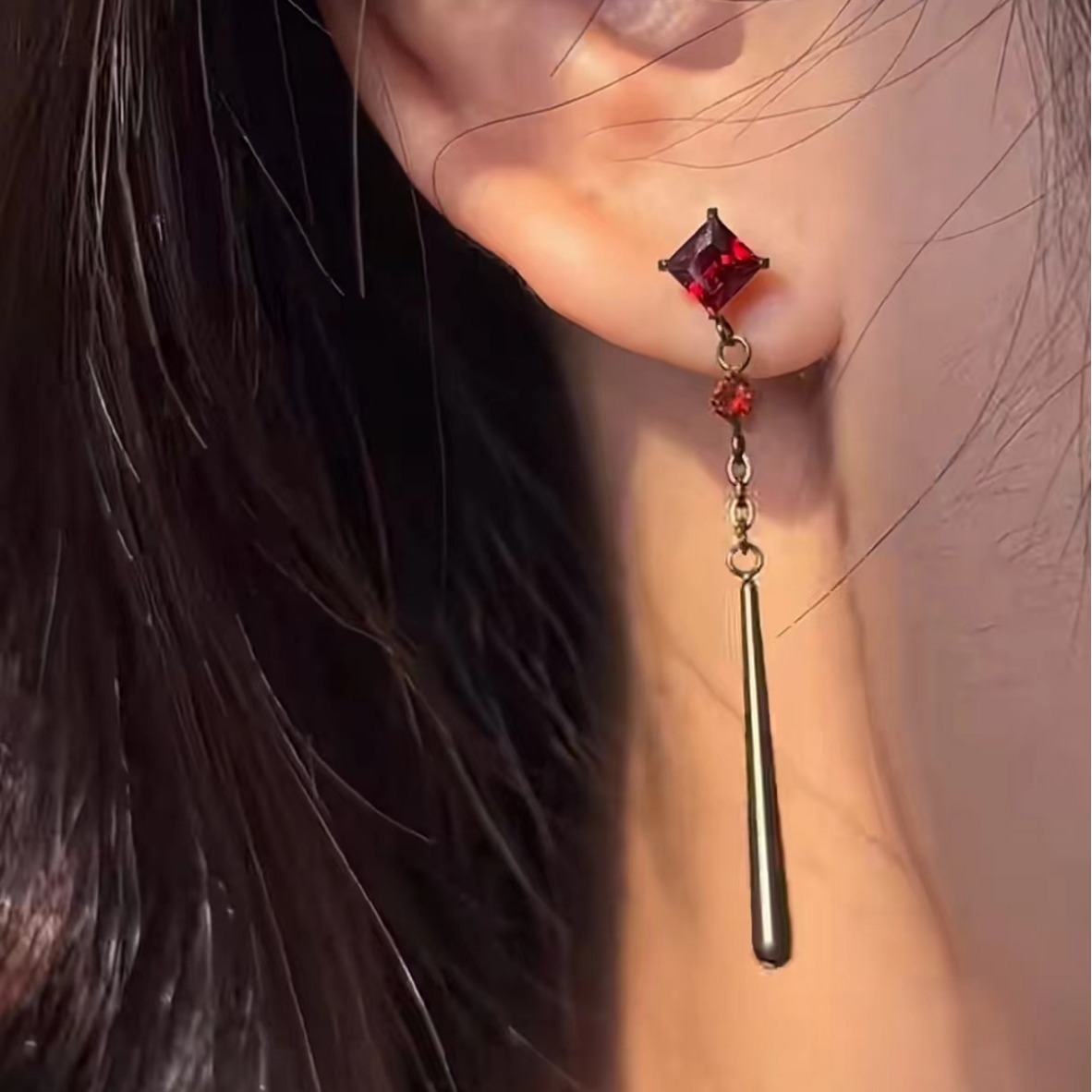 红色方糖水滴流苏吊坠耳钉轻奢高级感气质复古甜酷辣妹风长款耳饰