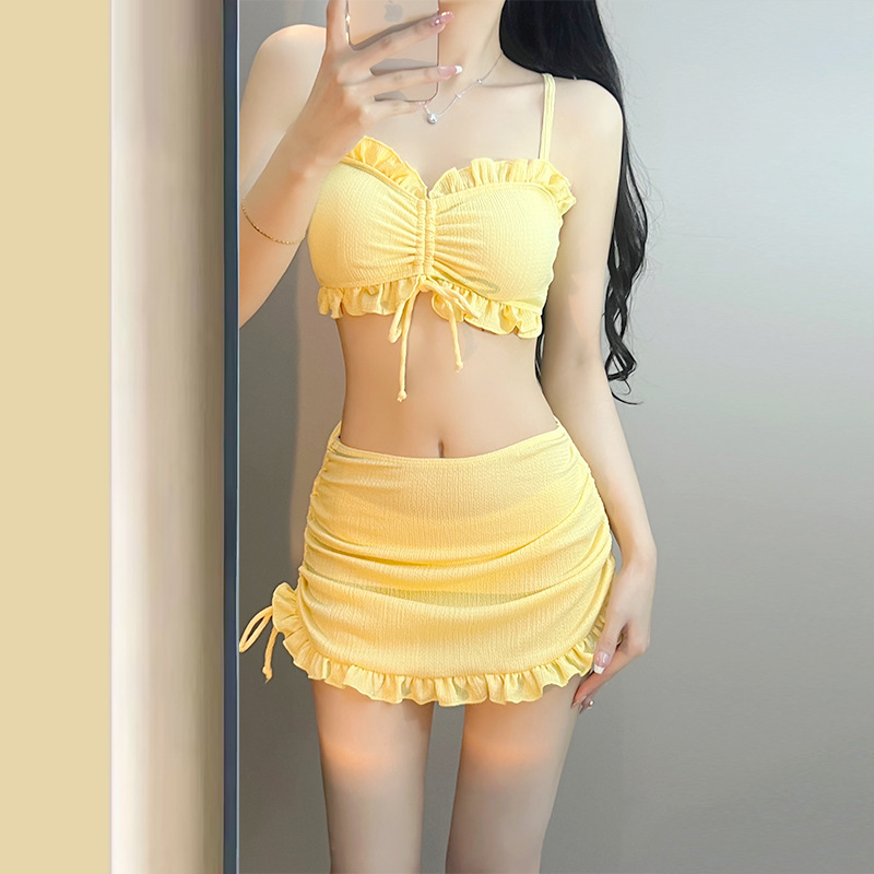 热卖新款泳衣女小清新无钢托聚拢显瘦纯色比基尼三件套泳装bikini