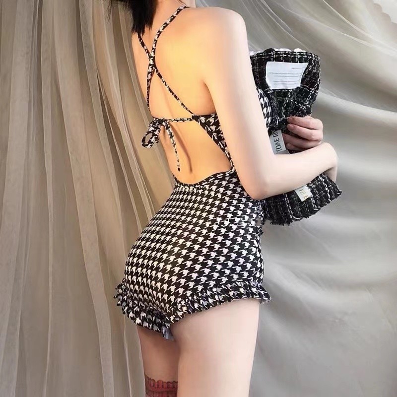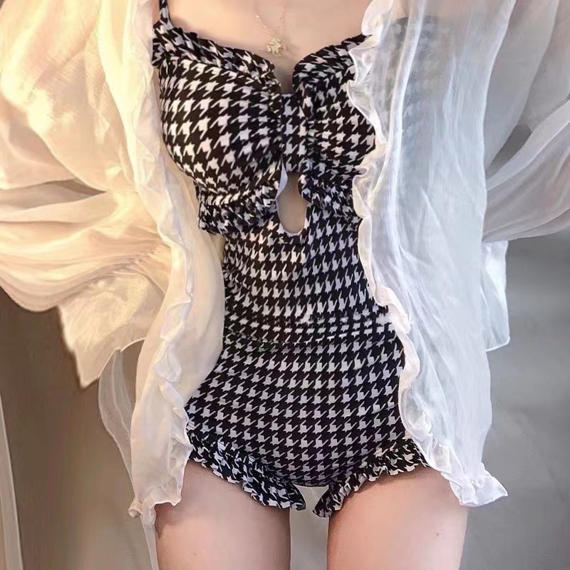 性感露背木耳边小胸千鸟格三角连体遮肚显瘦度假温泉泳衣女