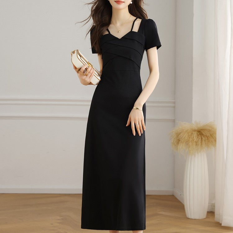 黑色法式挂脖裙子女夏季新款收腰a字裙气质高级长款短袖连衣裙