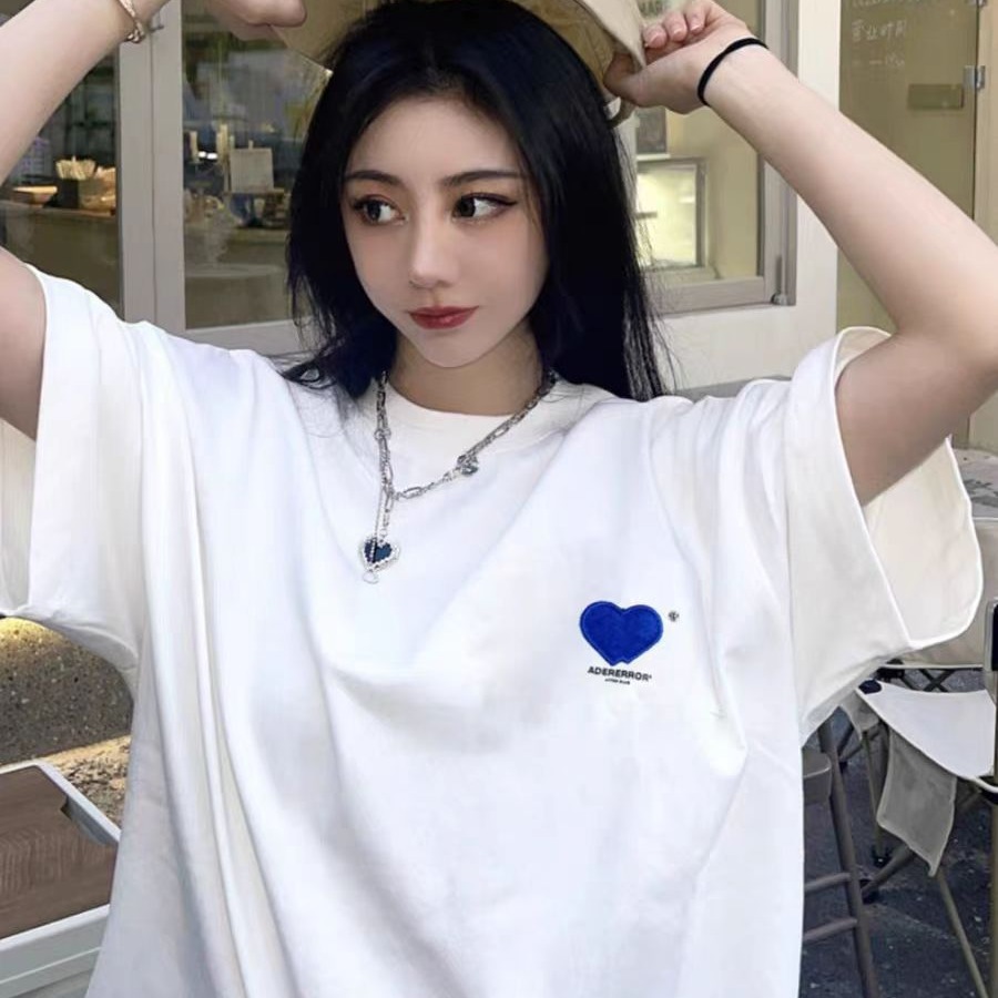 ader爱心刺绣T恤克莱因蓝圆领情侣短袖夏季女纯色上衣潮牌韩版ins