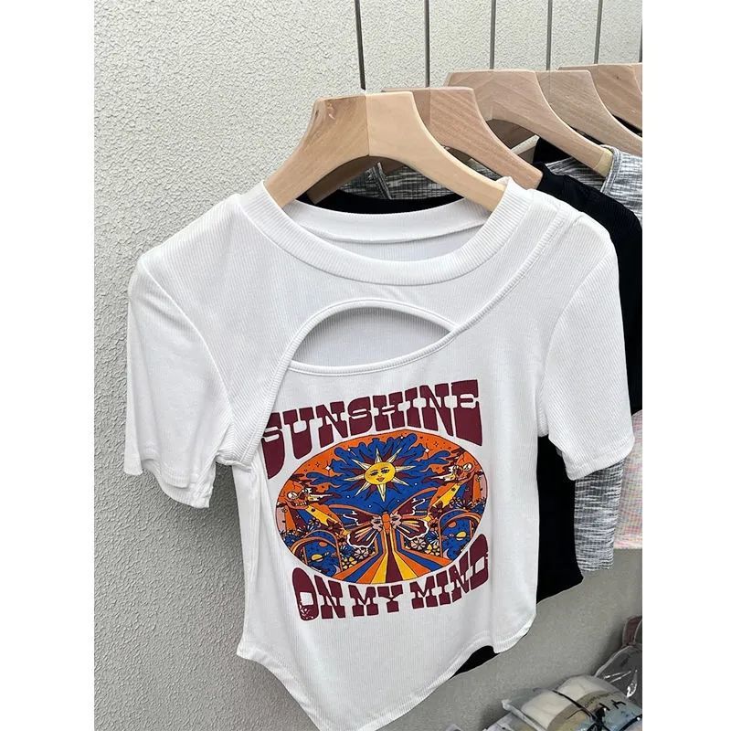 设计感镂空印花T恤女夏季新款修身显瘦打底衫不规则短袖ins风上衣