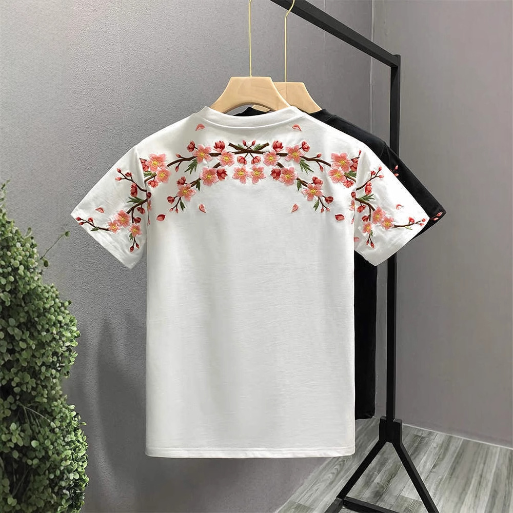 欧货时尚潮牌轻奢女T恤短袖青年梅花刺绣网红爆款小众半袖体恤土