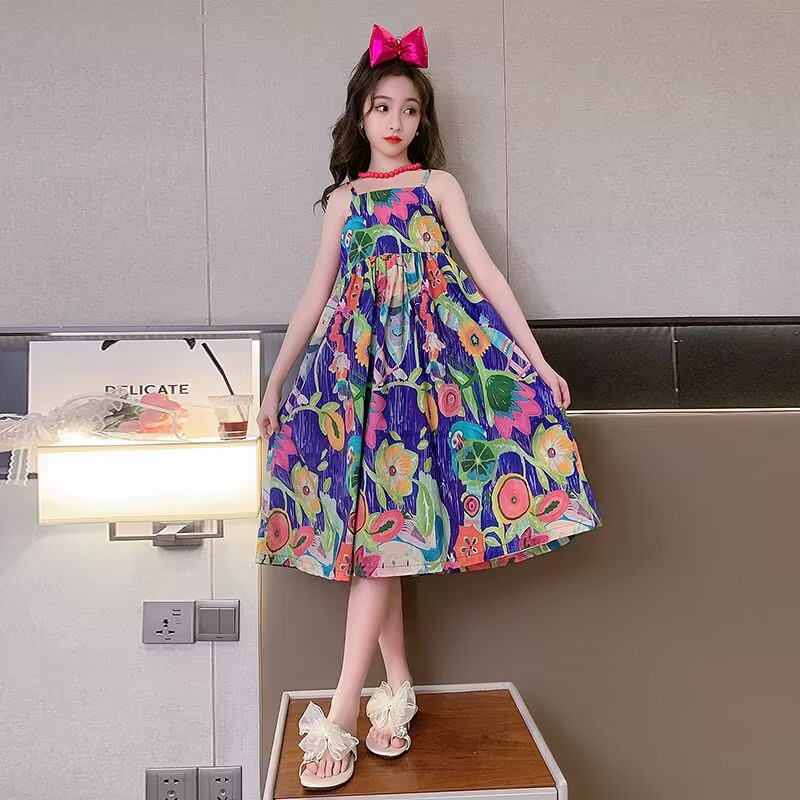 女童夏装薄款吊带裙新款中大童时髦油画连衣裙无袖宽松沙滩裙