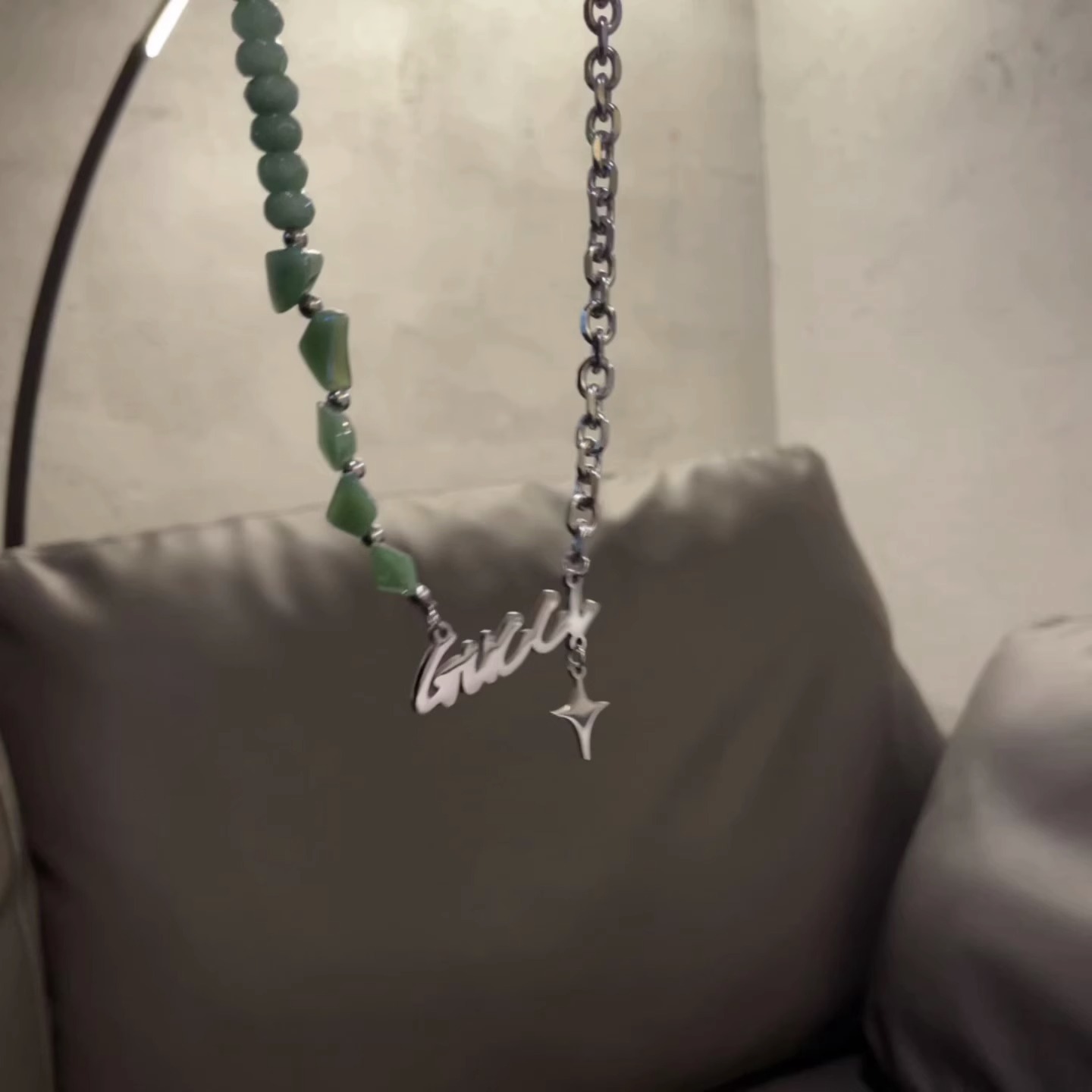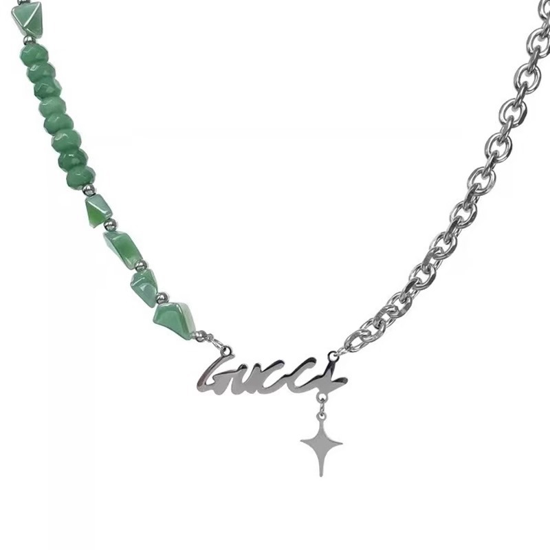 项链男款绿色串珠钛钢不掉色酷绿宝石十字架英文吊坠设计高级饰品