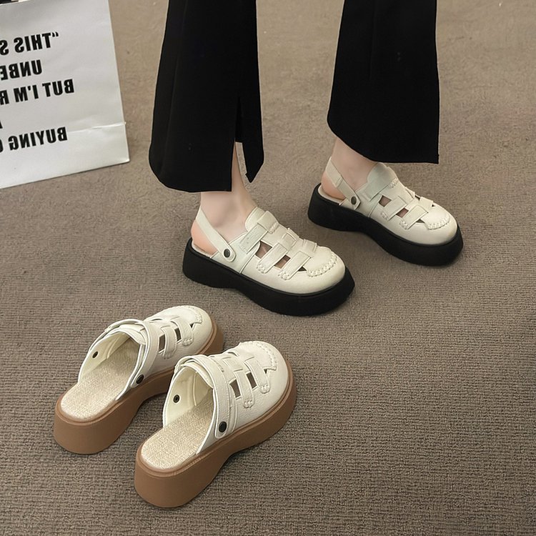 厚底两穿镂空包头凉鞋女夏季新款洞洞猪笼森系罗马半拖鞋外穿