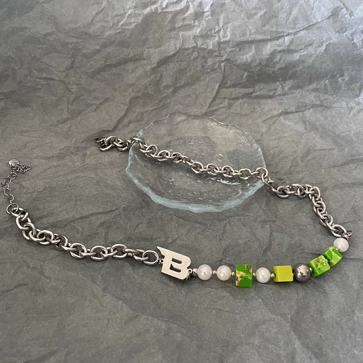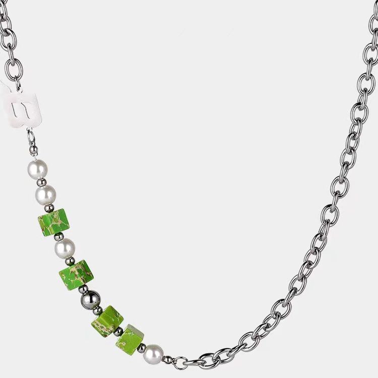 绿色串珠拼接项链男钛钢小众设计高级感简约风饰品