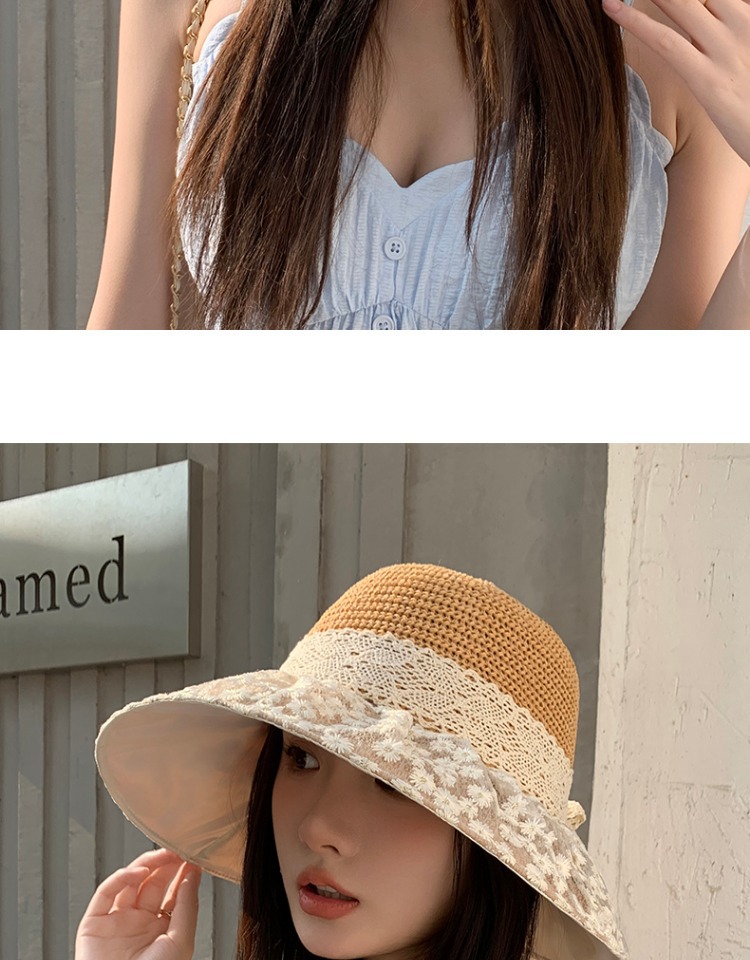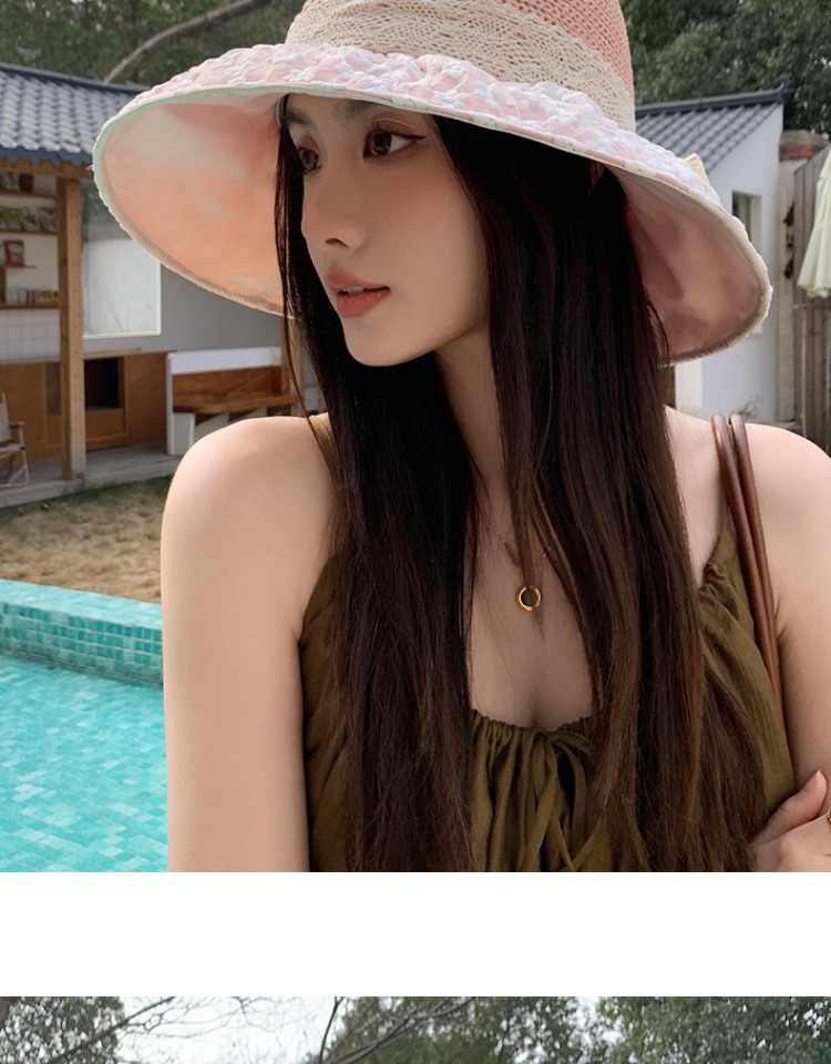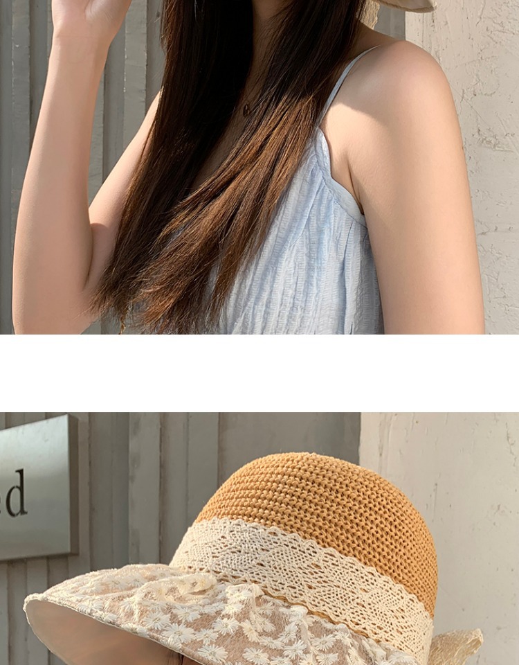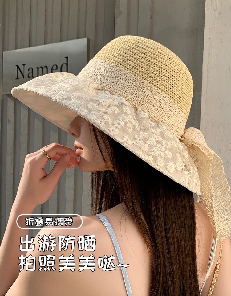 夏季新款法式蕾丝蝴蝶结渔夫帽女海边出游沙滩遮阳防晒太阳帽