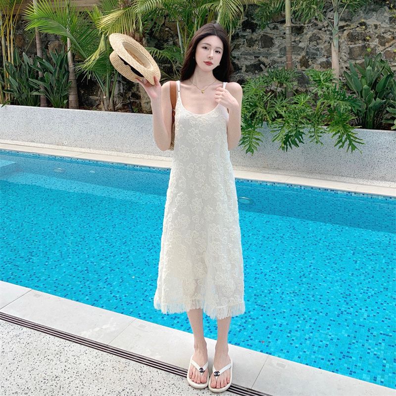 韩系流苏吊带裙女新款夏季设计感仙女白色打底裙中长款连衣裙