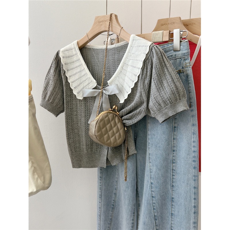 学院风灰色复古短袖Polo衫女夏小众单排扣针织开衫日系娃娃领上衣