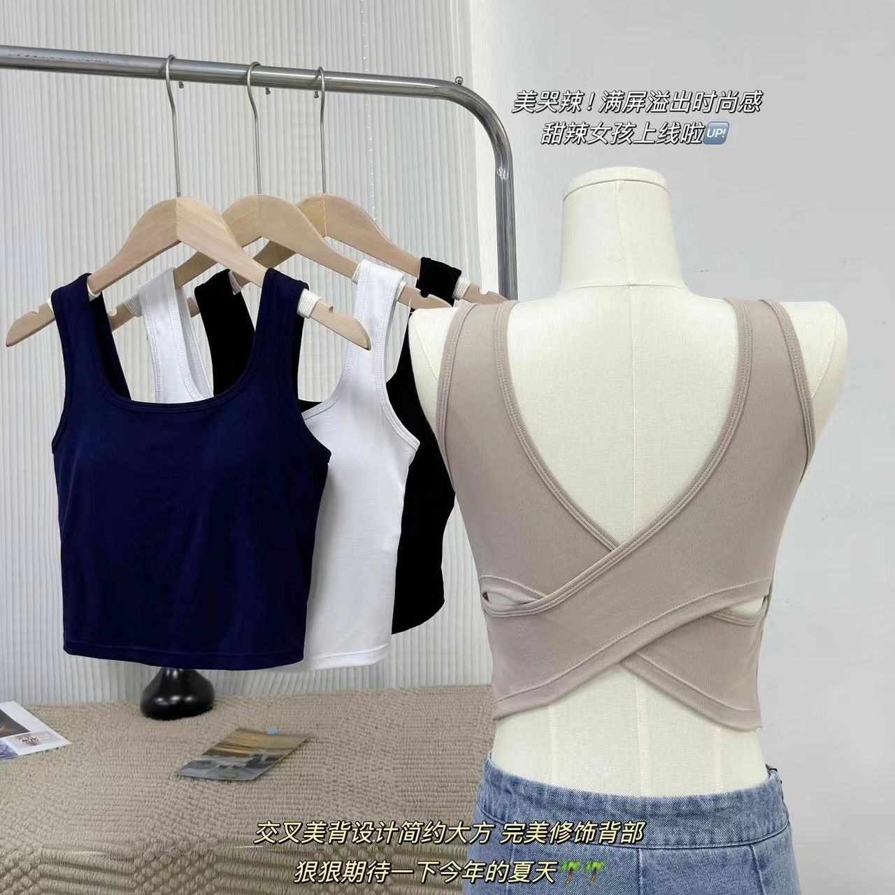 夏季冰丝宽肩背心女带胸垫固定杯显瘦交叉美背性感辣妹美背吊带女