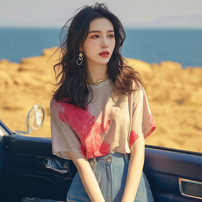 洋气独特超好看别致绝美漂亮宽松小上衣杏色晕染正肩短袖t恤女夏
