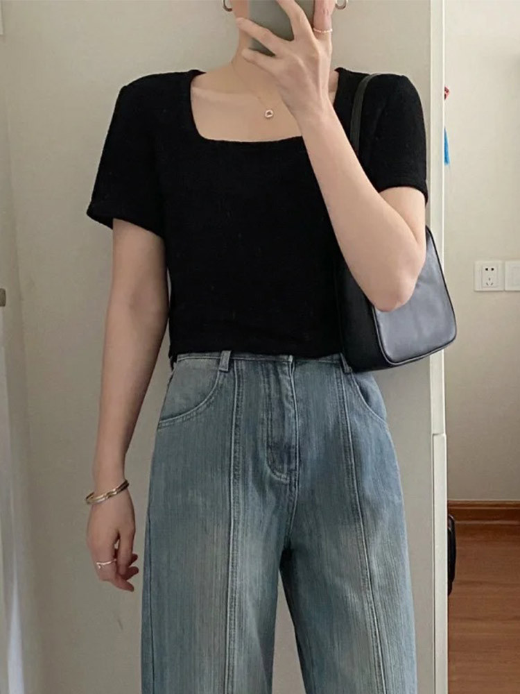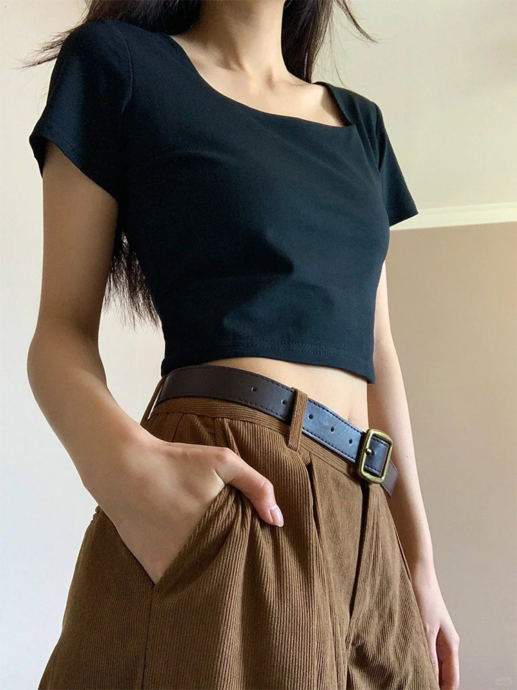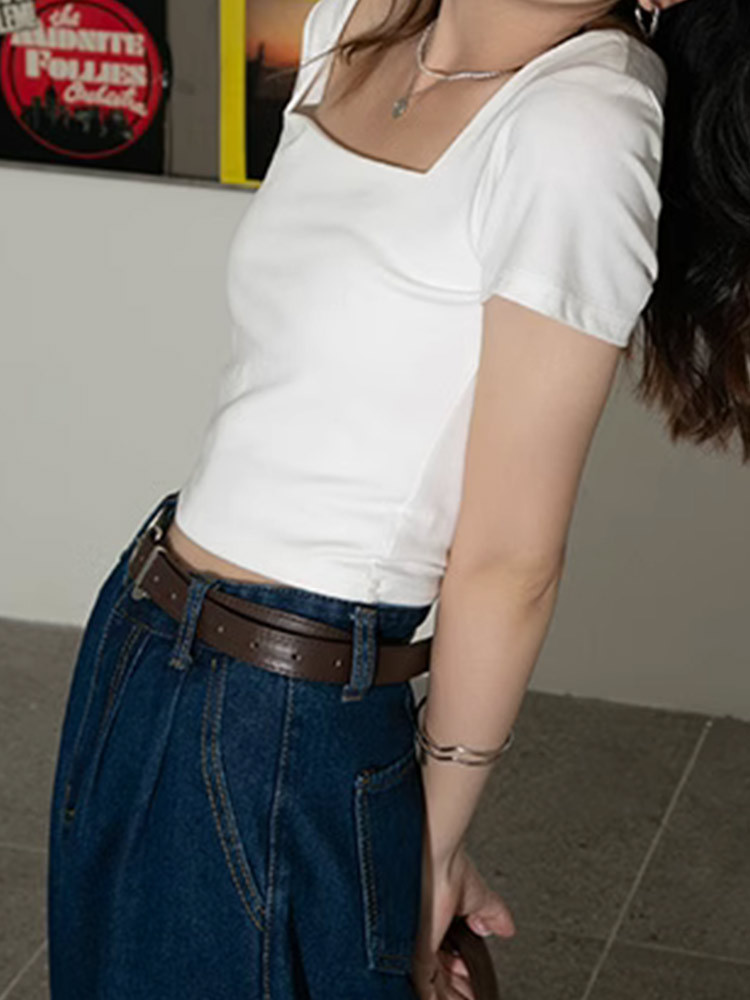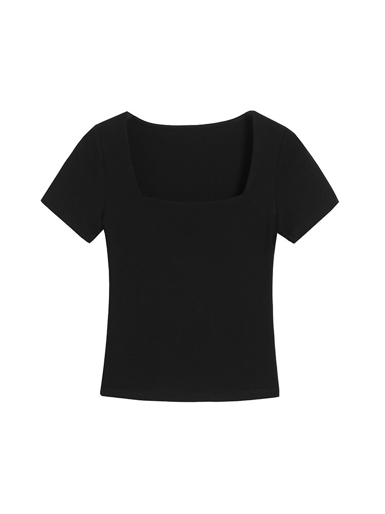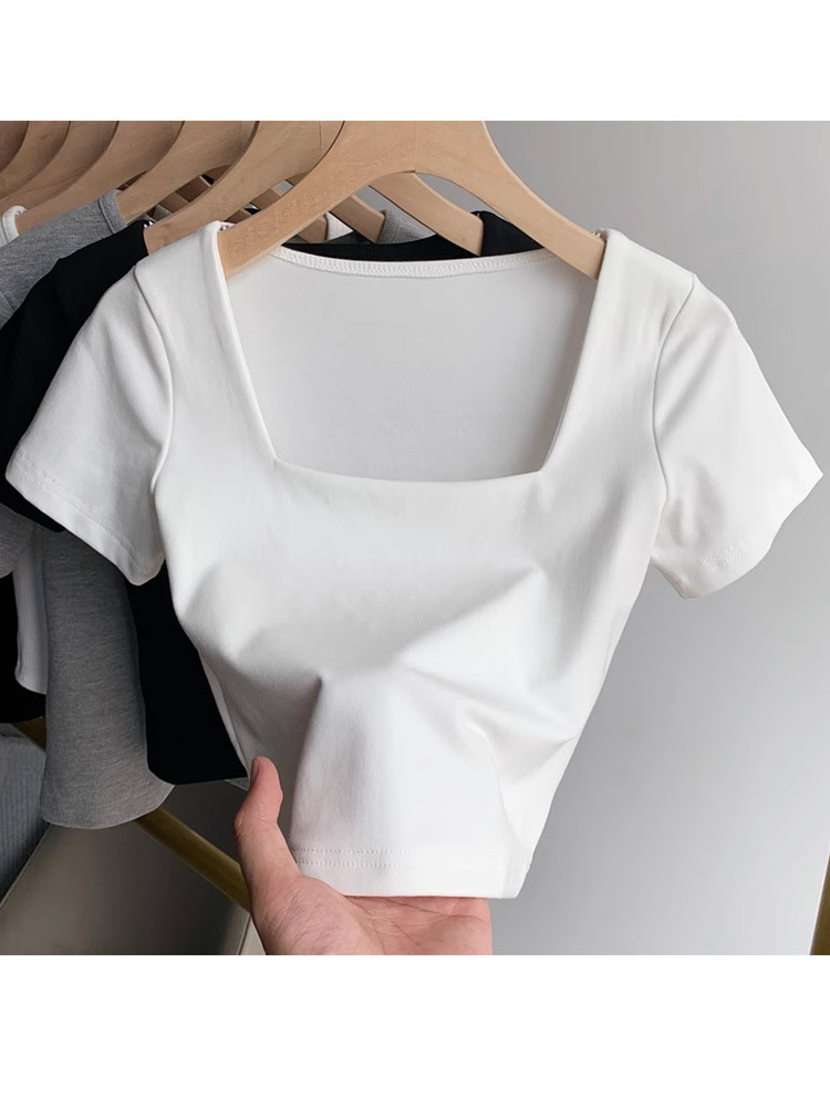 纯欲T恤方领短款女春夏新款修身白色短袖方领内搭打底衫上衣
