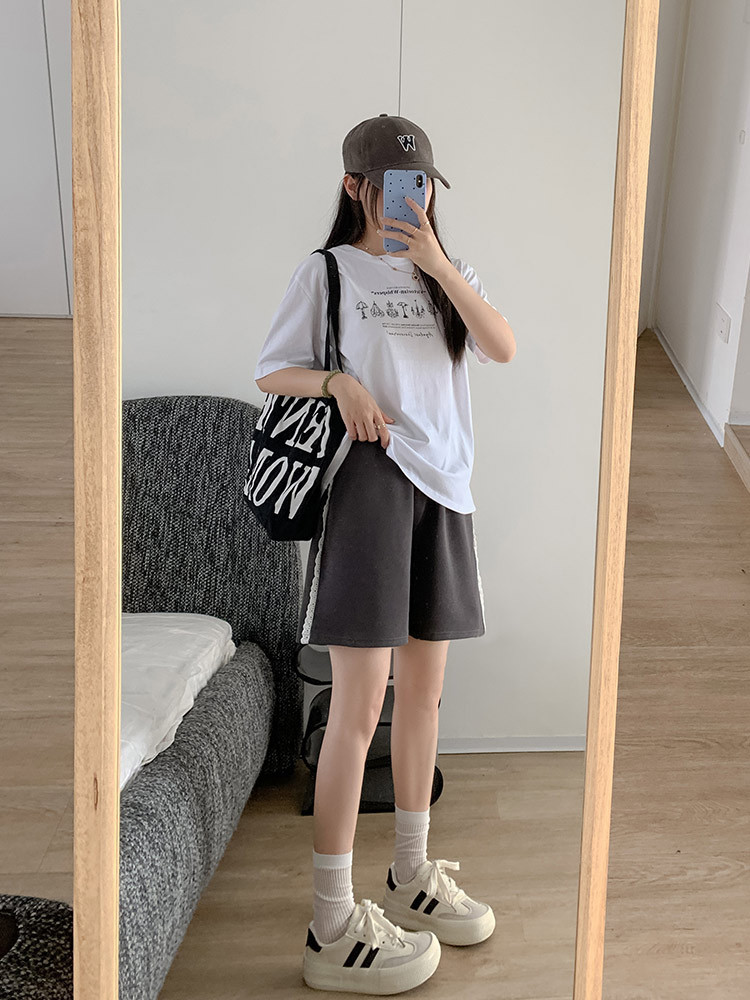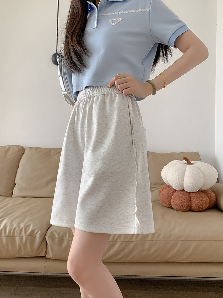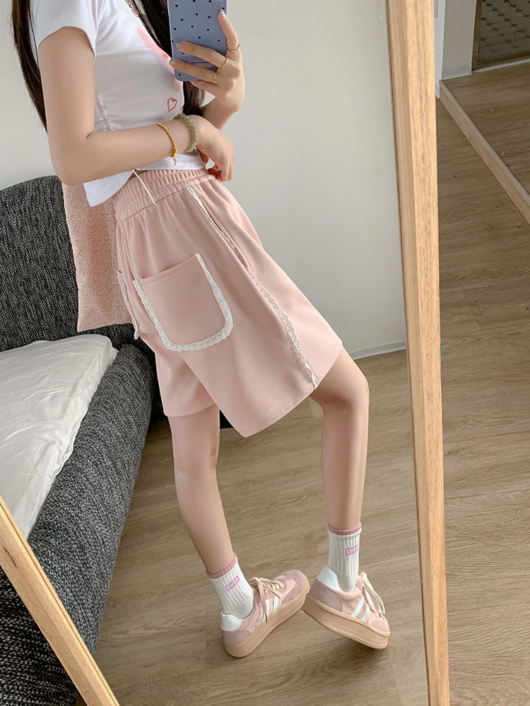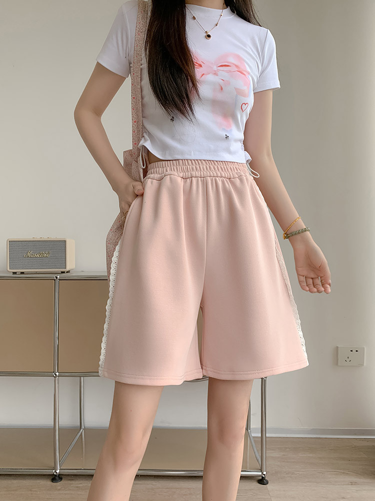 蕾丝边粉色运动短裤女夏薄款新款外穿高腰休闲阔腿中裤五分裤